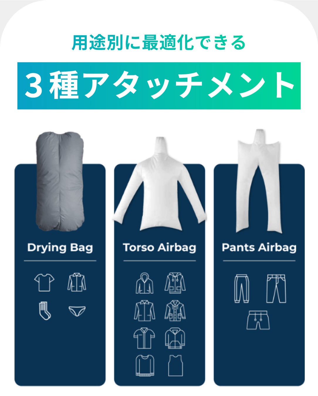乾燥バッグは、Tシャツ、下着、靴下などの小物に最適で、最大5点まで同時に乾燥とUV除菌が可能です。トルソーエアバッグは、シャツ、パーカー、ジャケット、セーターなどに対応し、乾燥とシワ伸ばしを一度で行えます。