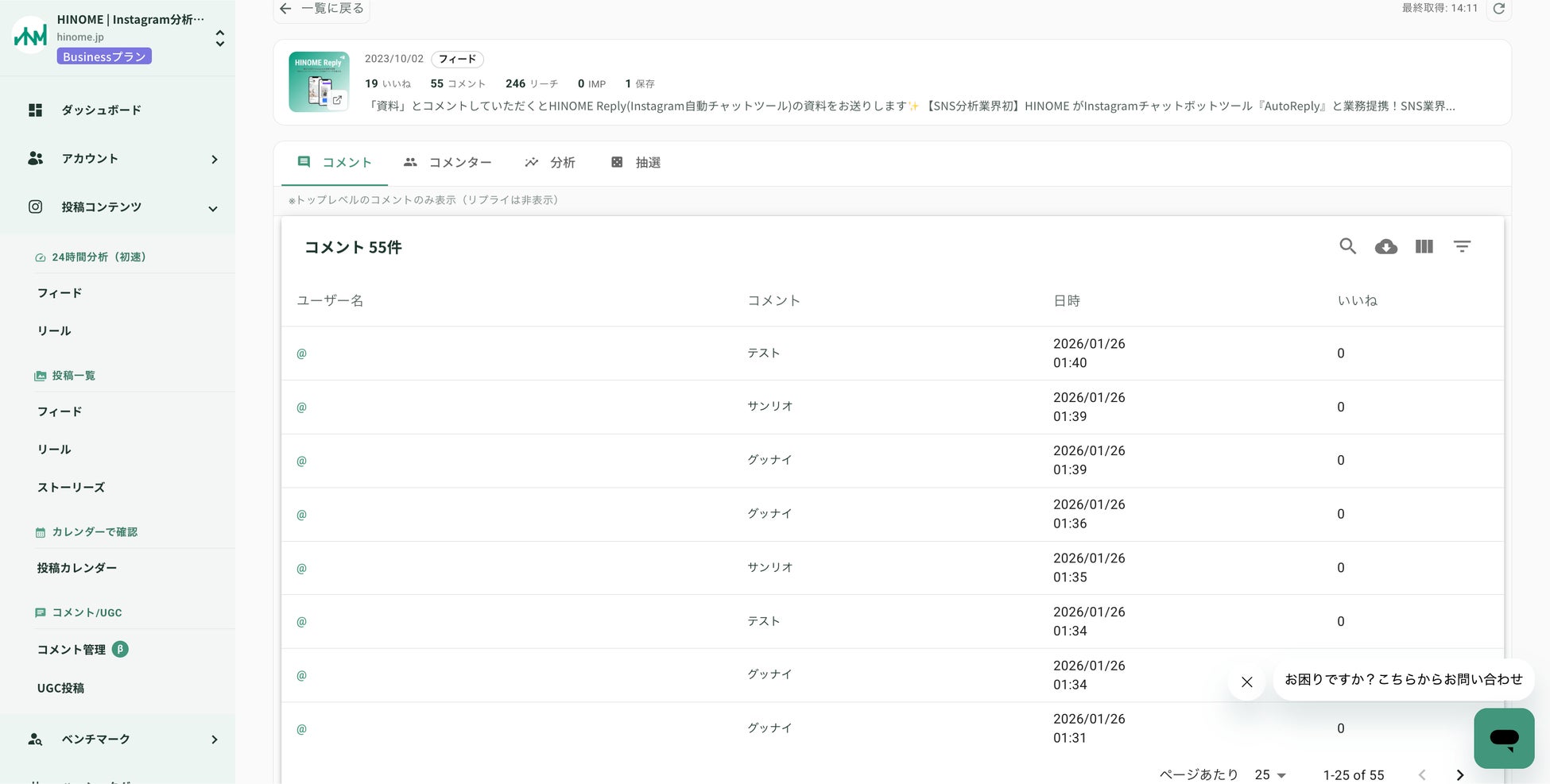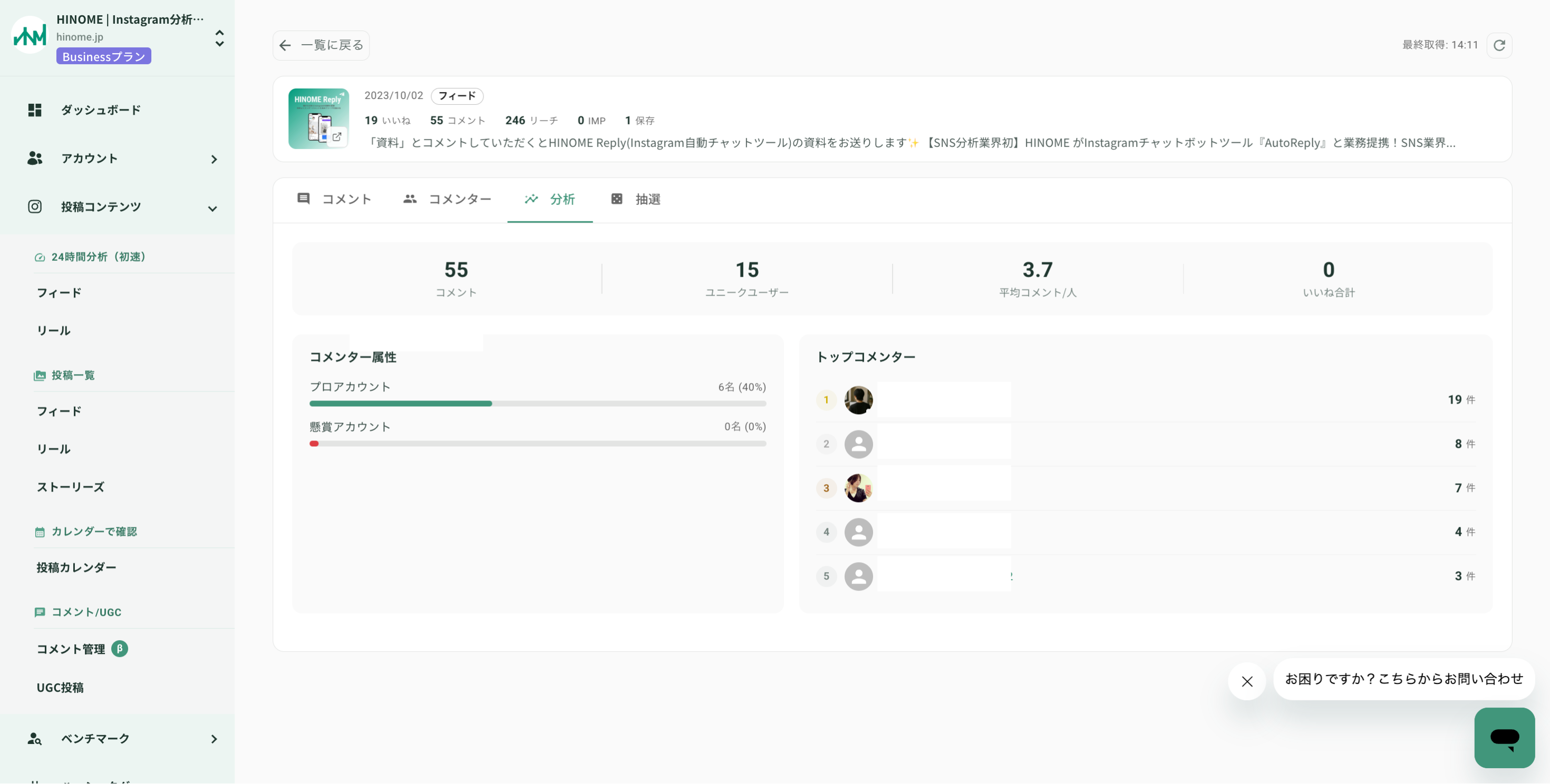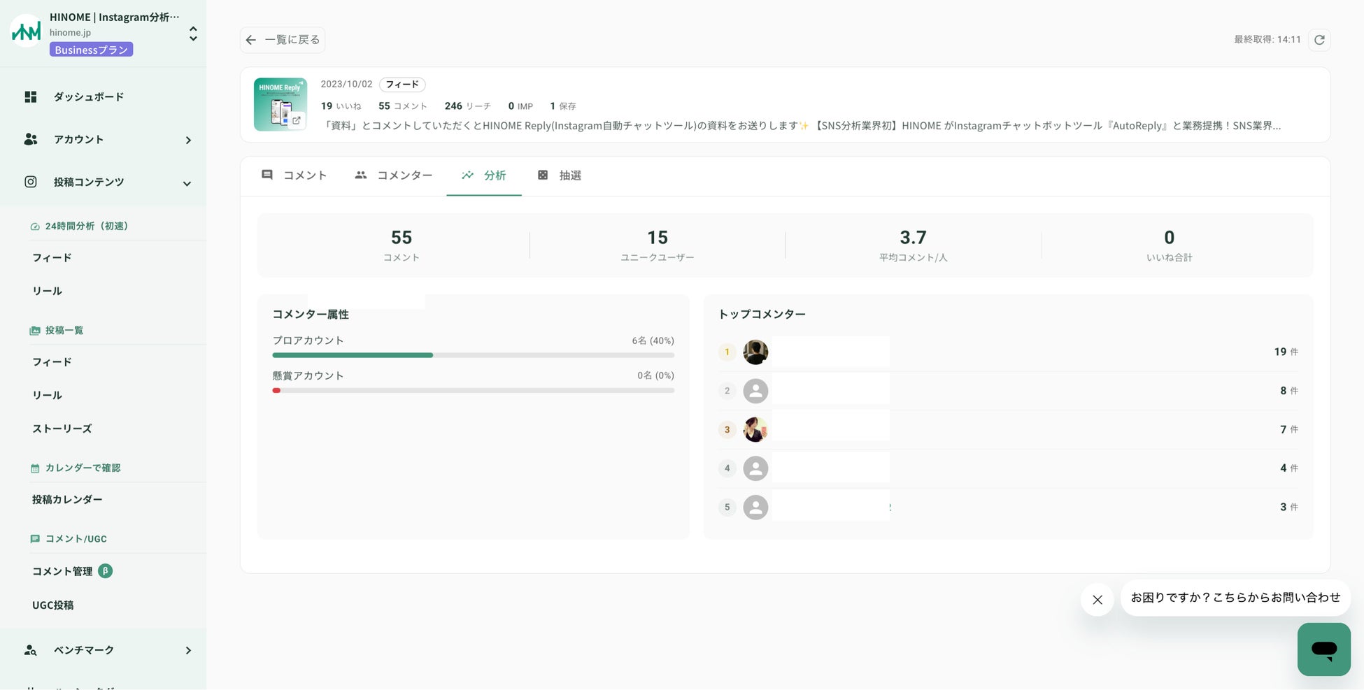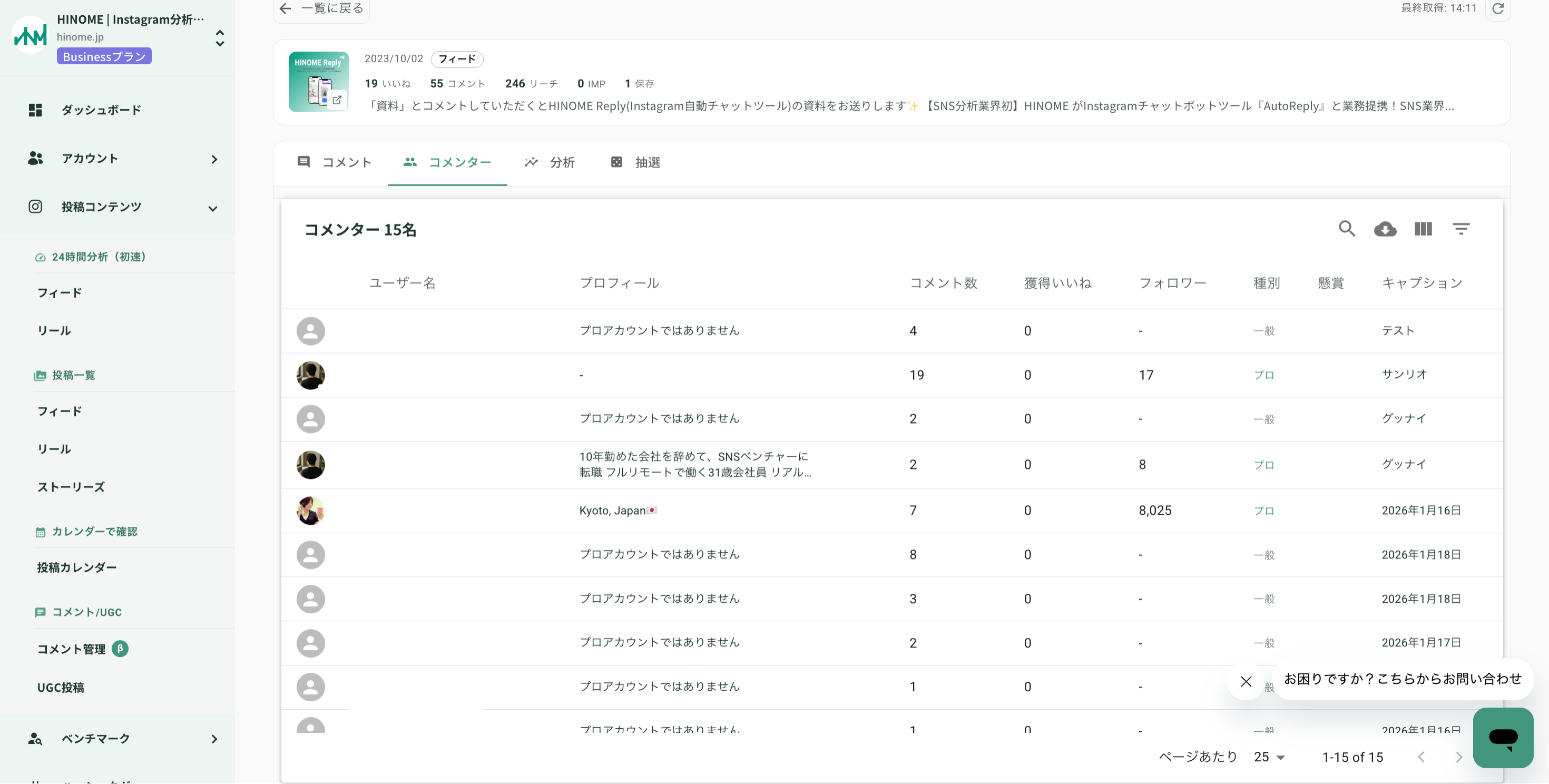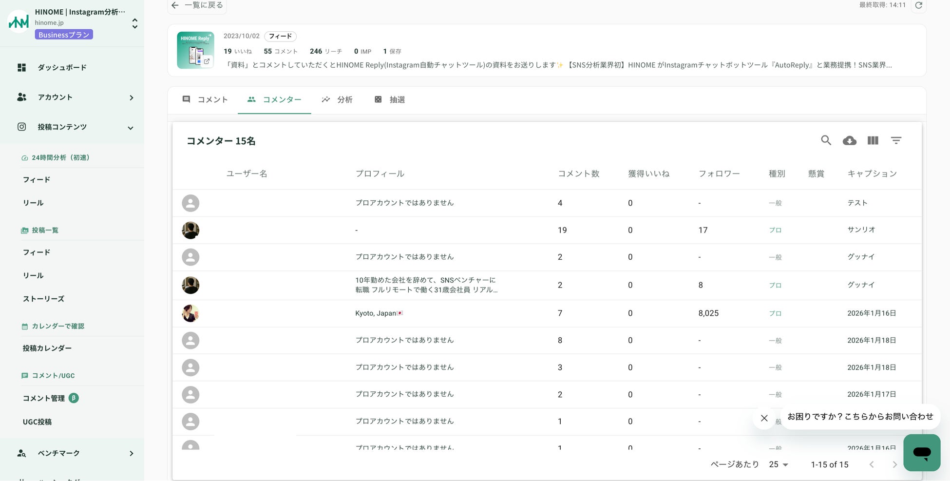 プロフィール属性分析: コメント主のプロフィール情報までHINOME上で把握可能。フォロワー数やバイオグラフィから「マイクロインフルエンサー」や「コアファン」を特定し、ターゲティングの精度を向上させます。