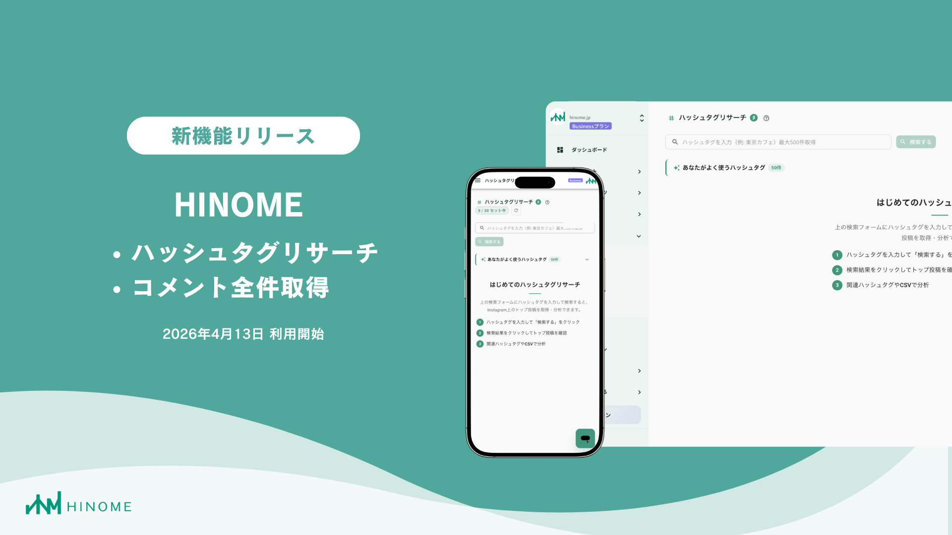 Instagram運用ツール『HINOME』は、2026年2月に提供を開始したMeta広告出稿機能に続き、このたび「ハッシュタグリサーチ」および「コメント全件管理」の2つの強力な新機能をリリースいたしました。
