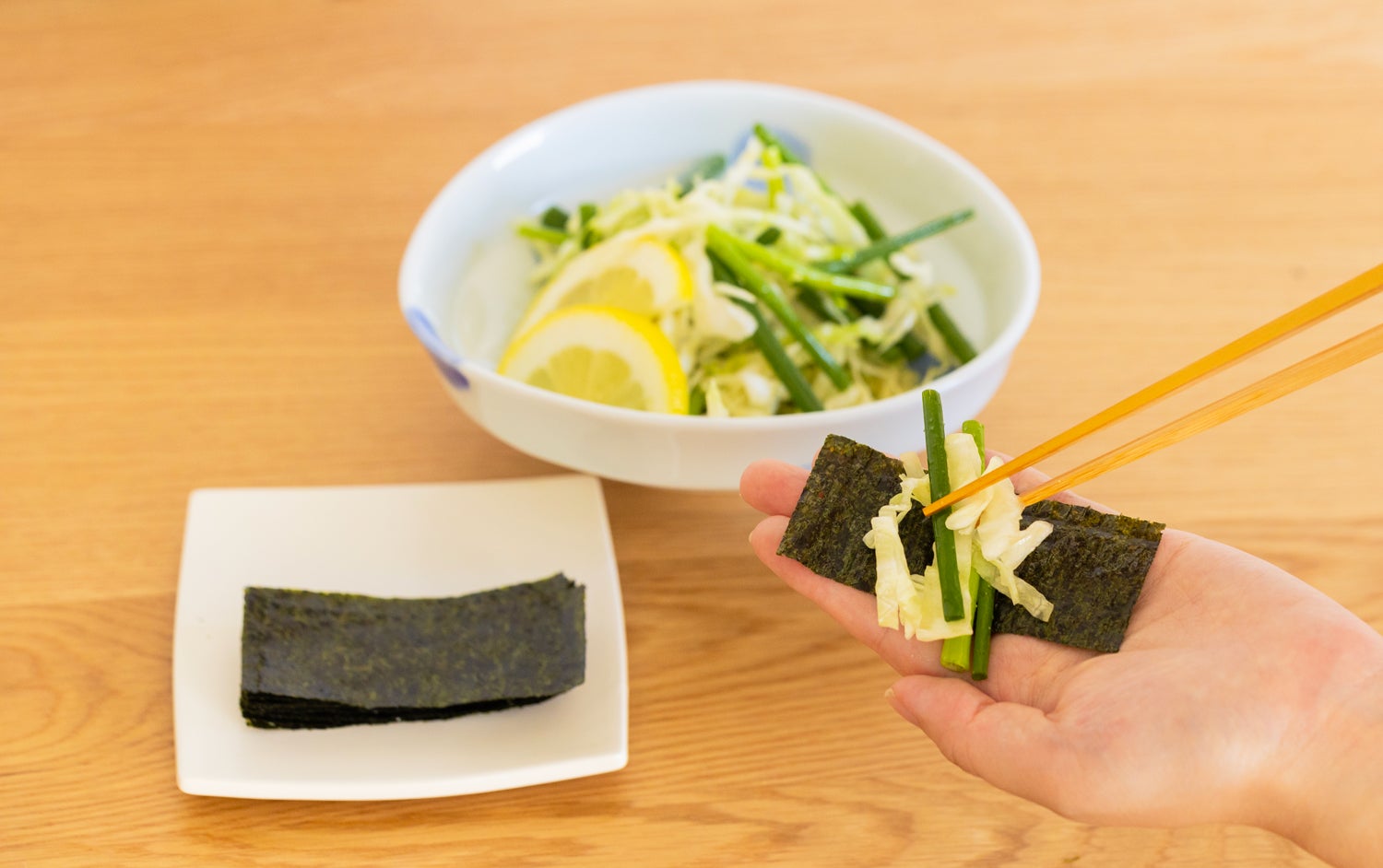 塩味の調味液で味付しているので、そのまま食べても手が汚れにくく、ほんのり塩の味わいに。