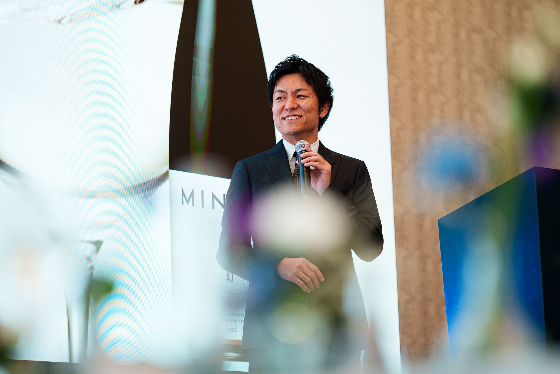 昼の部のメディア向けイベントでは、MINAKIが掲げる「体験設計」の哲学を軸に、日本酒の香りや味わいはもちろん、所作や空間演出も含めた“体験としての日本酒”を紹介。参加者は3種の銘柄を通じて、MINAKIが表現する世界観を五感で体験しました。皆木のプレゼンテーションでは、IWC(International Wine Challenge)など世界6つの品評会での受賞歴や、国内外300店舗以上での採用実績に触れ、MINAKIが築いてきた信頼と表現力が語られました。