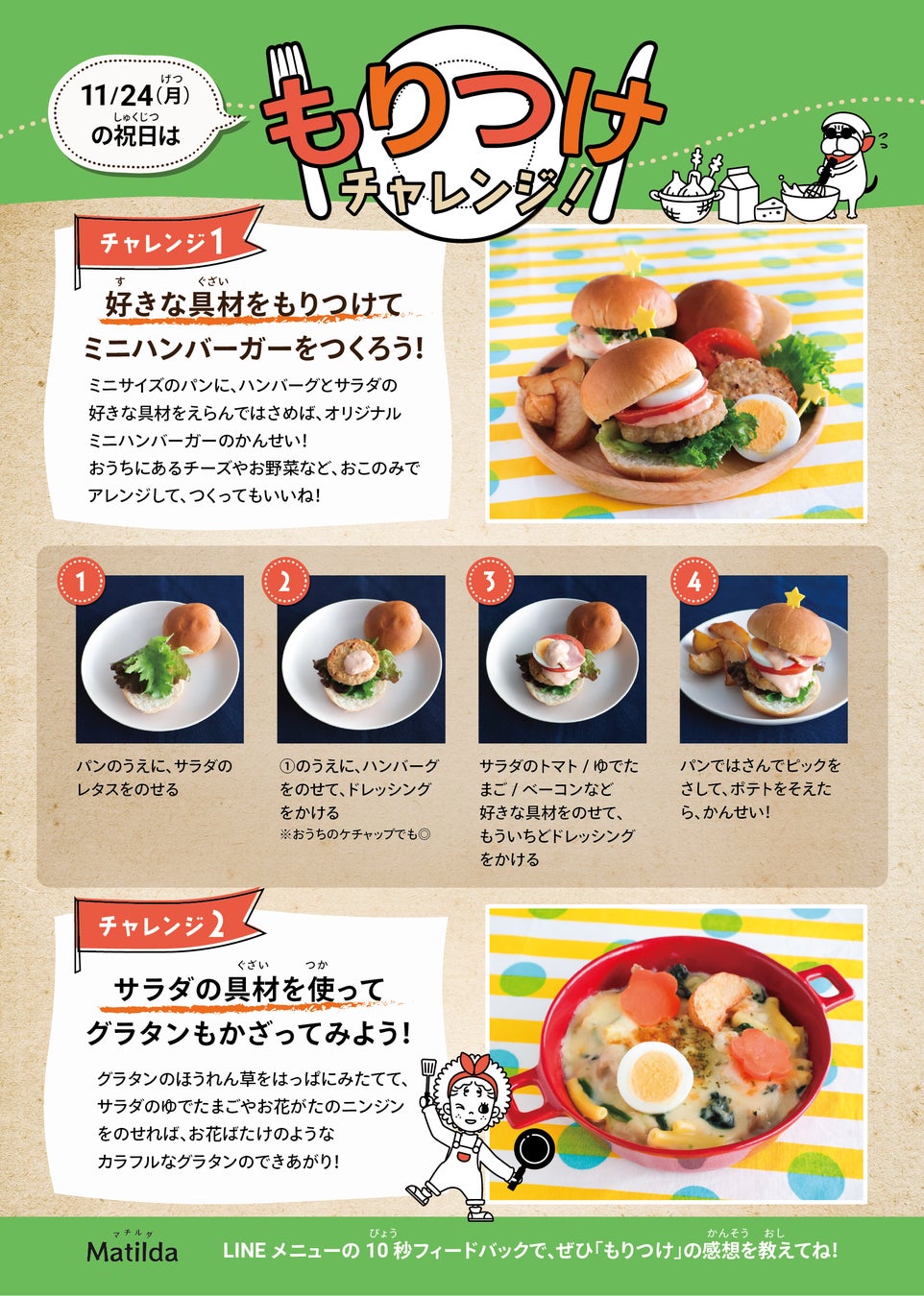 街に溶け込む新しい中食サービス「マチルダ」(以下 マチルダ)を提供する株式会社マチルダ(本社:東京都江東区、代表取締役:丸山由佳、以下 弊社)は、2025年11月24日(祝)の夜ごはんに自分で具をはさんで完成させる体験型メニュー「自分ではさむ!ミニバーガー&フライドポテト」を中心に、盛り付けそのものを楽しめるよう献立全体を設計した「もりつけチャレンジ」メニューを提供しました。