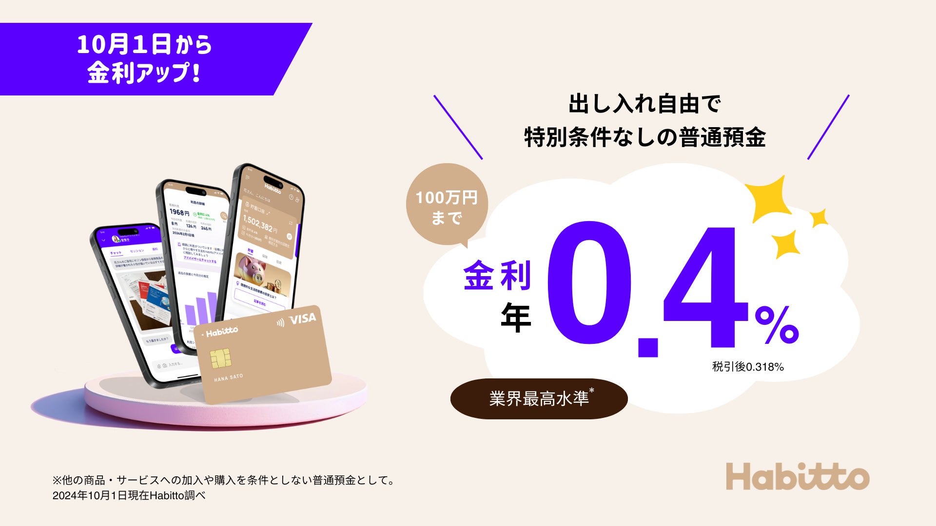 東京都(日本)– 2024年10月1日 – 7月末に日本銀行が国内金利の引き上げを決定したことを受け、「アドバイスするデジタルバンク」Habittoは、2024年10月より預金額100万円までの金利を0.3%から0.4% (税引後0.318%)に引き上げました。Habittoのこの金利は国内最高水準*であり、上昇する金利のすべてを顧客に還元する姿勢は、お客さまの資産形成を支援することへのHabittoのコミットメントを示すものです。