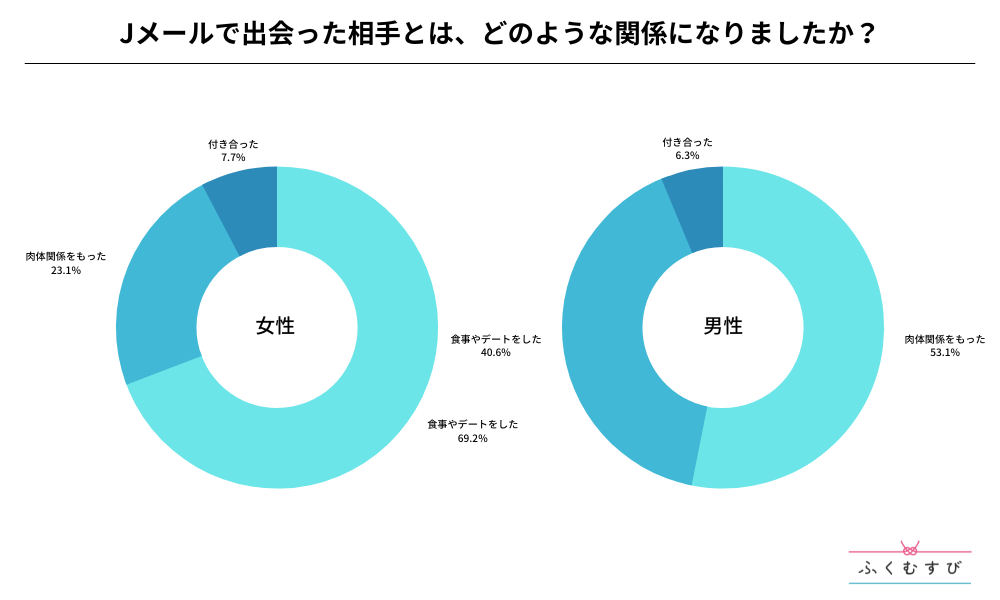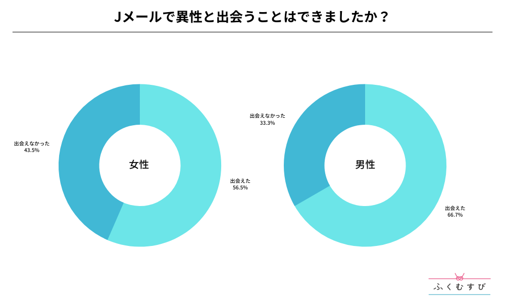 ・Jメールで異性と出会えた割合は、男性が66.7%、女性が56.5%となりました。