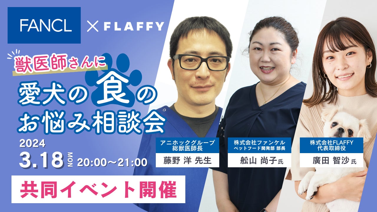 “イヌとヒトの関係をフラットに”をコンセプトに、14万フォロワーの国内最大級の犬情報メディア事業や人間の服を愛犬の服にリメイクするサービスを複数展開する株式会社FLAFFY(本社:東京都渋谷区、代表取締役:廣田 智沙/以下 当社)は、株式会社ファンケル(本社:神奈川県横浜市、代表取締役社長執行役員:島田 和幸/以下 ファンケル)と共同で、愛犬の食に関するお悩みをFLAFFY.me公式アカウントで事前に集め、獣医師の藤野先生をお招きし、「愛犬の“食”についてのお悩みを、獣医師さんに聞いてみよう!」のイベントをInstagramのLIVE放送にて開催します。