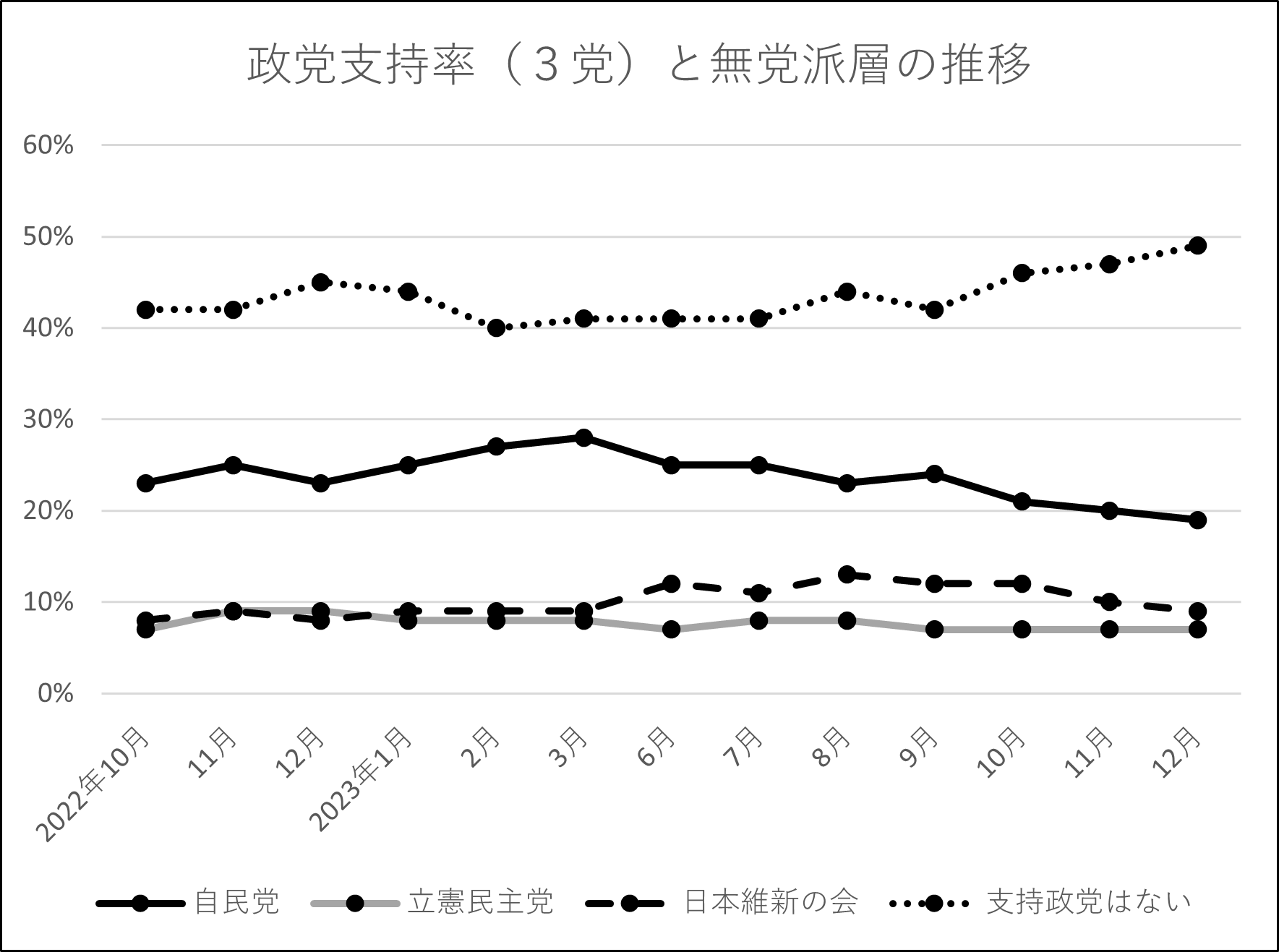 2.政党支持率は自民19%・維新9%・立憲7%・無党派49%