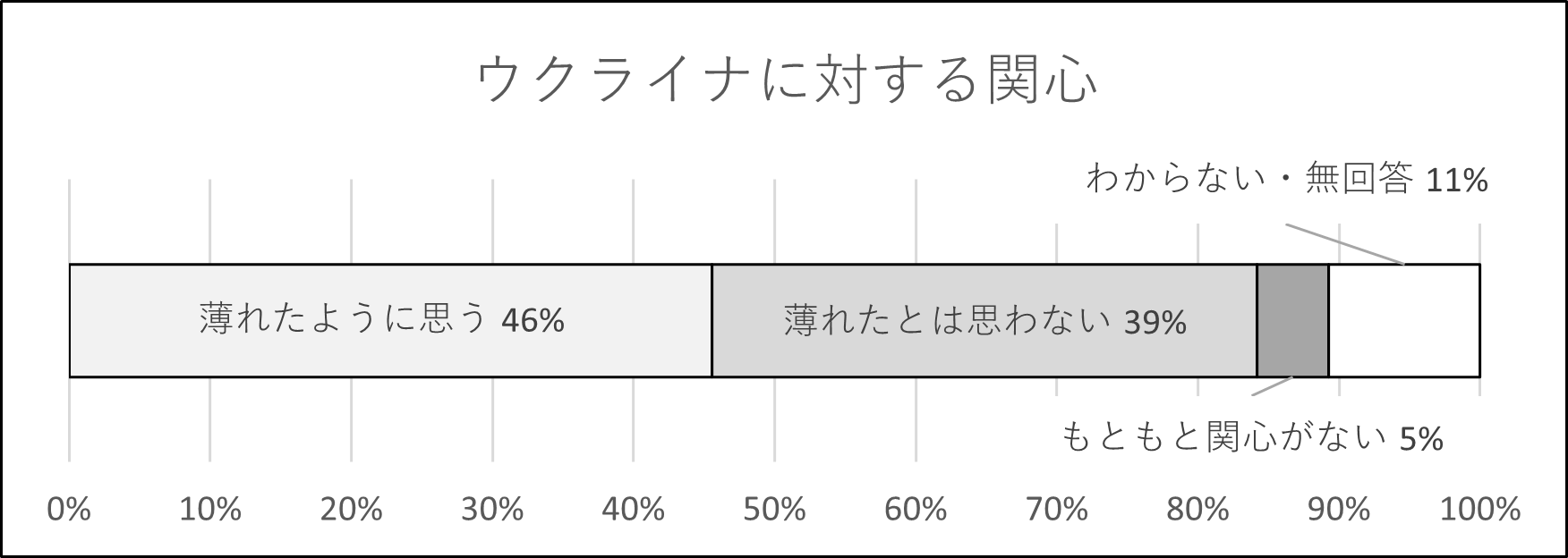 一方、ロシアによるウクライナ侵攻も続いているが、中東情勢の影響でウクライナに対する「関心が薄れたように思う」と46%が回答し、「関心が薄れたとは思わない」の39%を上回った。