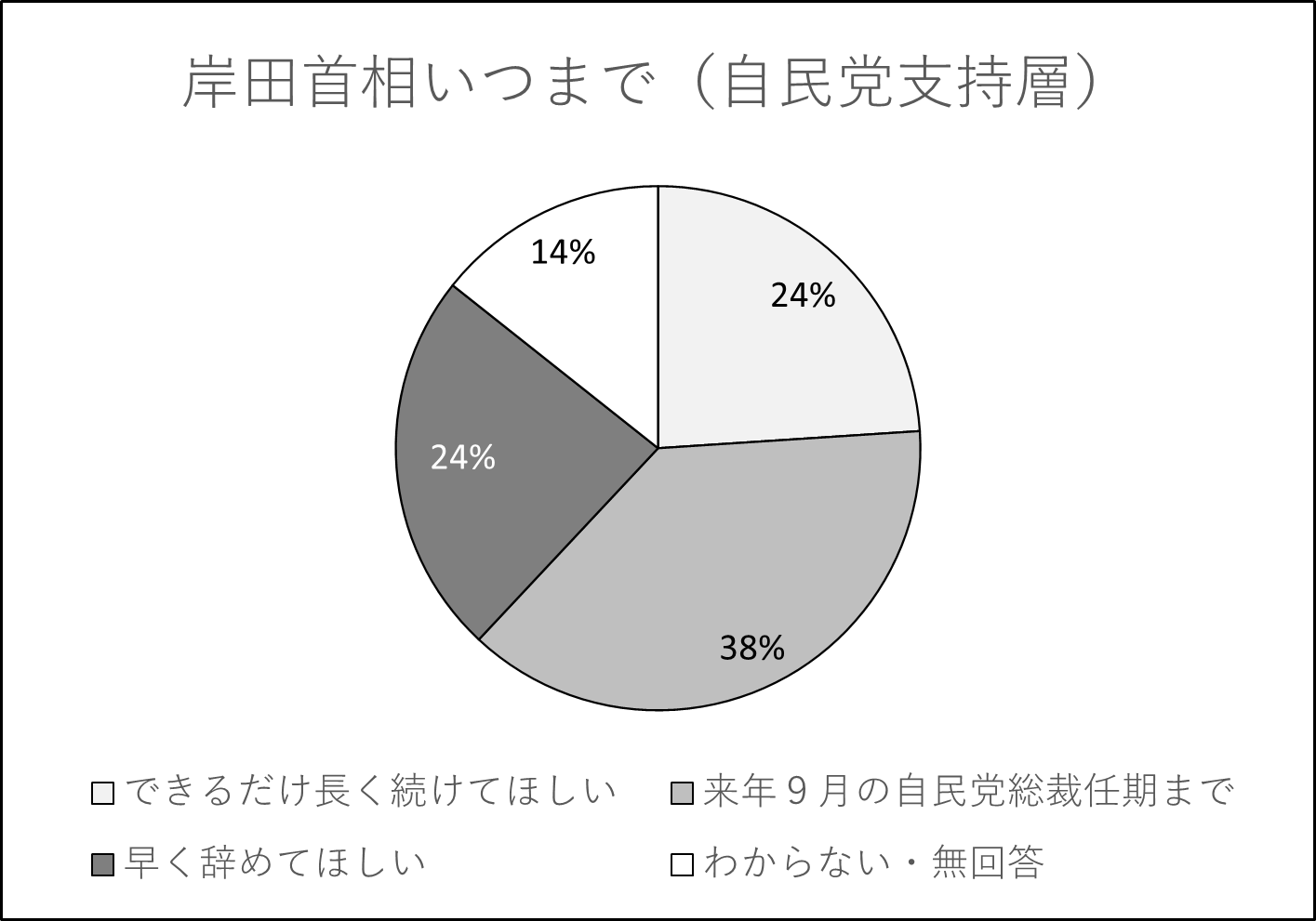 岸田首相にいつまで首相を続けてほしいと思うかを尋ねたところ、「早く辞めてほしい」が51%と過半数を占め、「来年9月の自民党総裁任期まで」が23%、「できるだけ長く続けてほしい」はわずか7%だった。自民党支持層でも「できるだけ長く続けてほしい」は24%にとどまり、「来年9月の自民党総裁任期まで」が38%、「早く辞めてほしい」が24%と6割超が岸田総裁の再選を望んでいない結果となった。