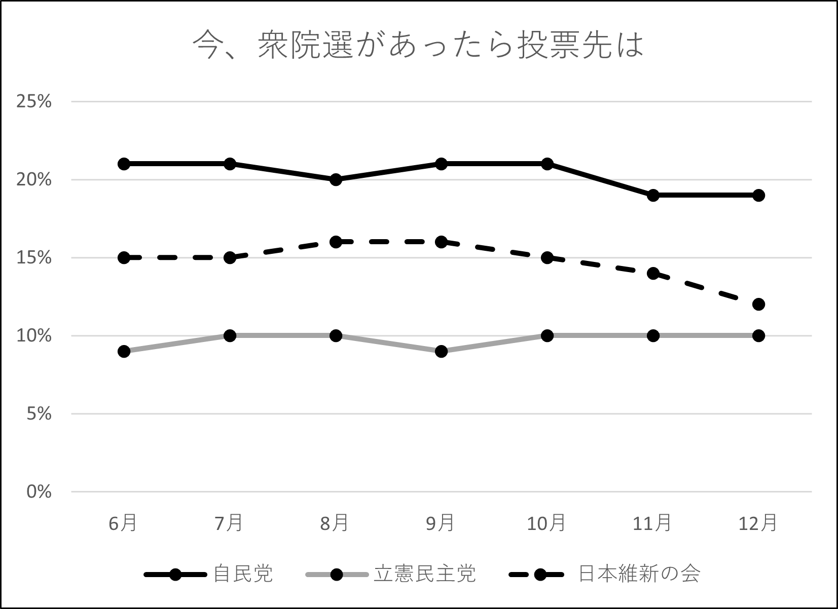 仮に今、衆院選が行われたら比例代表でどの政党に投票するかを質問したのに対しても、自民党は19%で政党支持率と変わらず、日本維新の会は8月の16%から今回は12%に減速。立憲民主党はやはり横ばいの10%となっている。