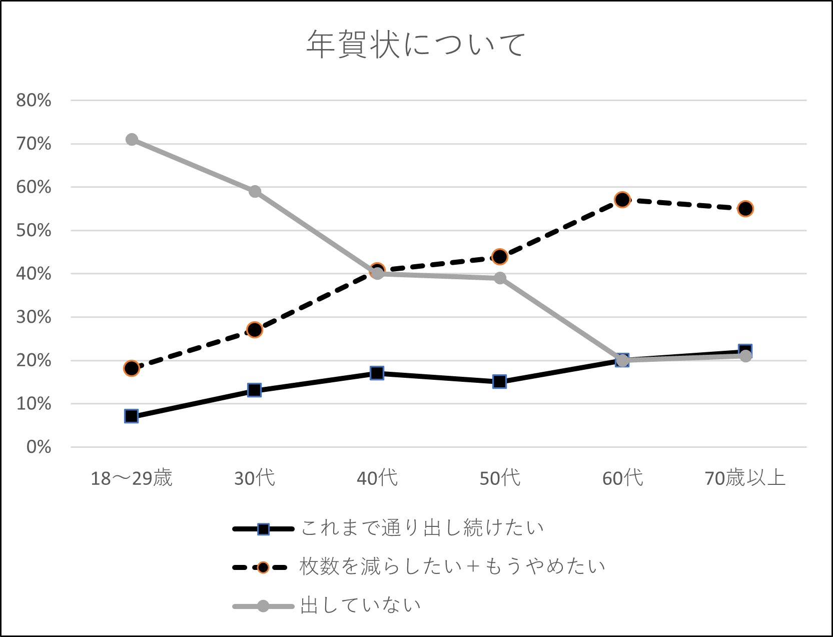 年代別にみると、18〜29歳の7割、30代の6割が「出していない」と答えたのに対し、40代・50代の6割、60歳以上の8割が年賀状を出していることになる。その中で40代・50代の4割以上、60歳以上の6割近くが年賀状離れを模索している状況が浮かぶ。