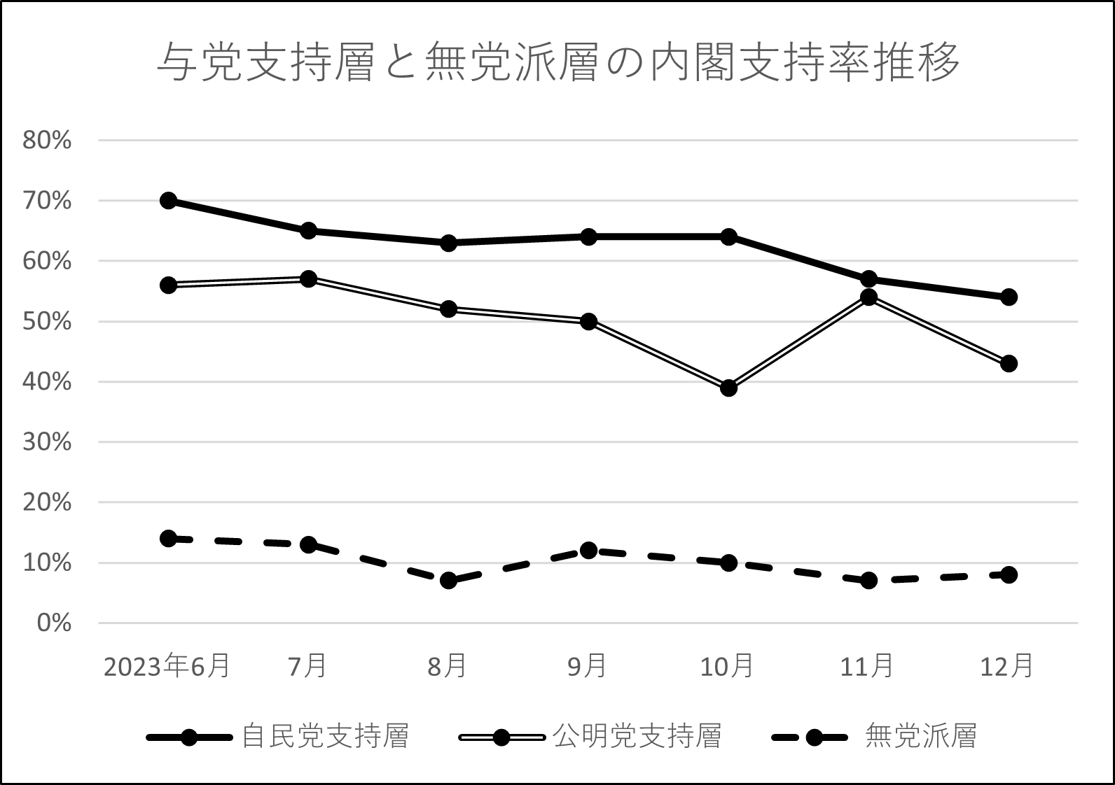 自民党支持層の内閣支持率は6月調査では70%あったが、今回の調査では54%まで下落した。公明党支持層の内閣支持率は43%となり、不支持率が過半数の51%に達して支持・不支持が逆転した。与党支持層の間で岸田首相を支える意識が薄れている状況と言えそうだ。「支持政党はない」と答えた無党派層の内閣支持率は8%だった。
