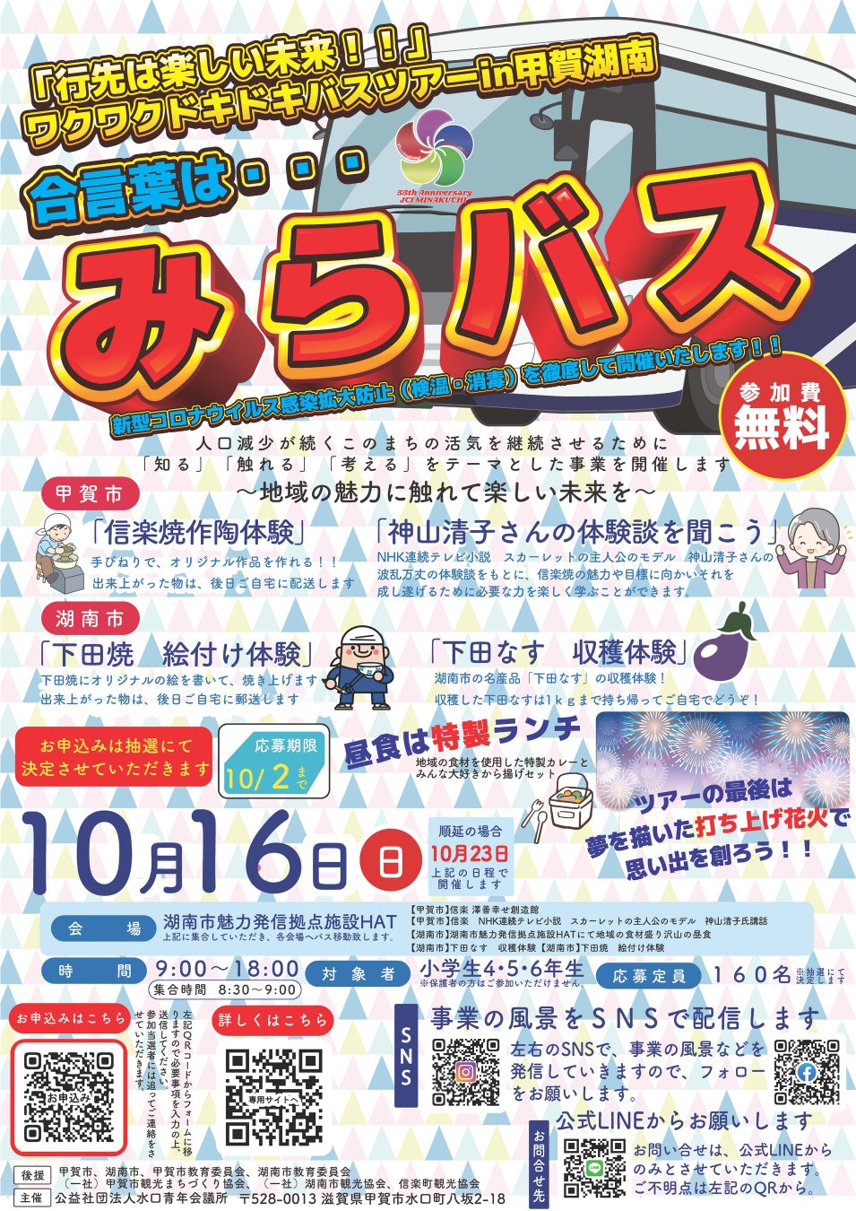 提供します。シビックプライドに繋がる意識変革を目的とし、湖南市では下田なす収穫体験、下田焼絵付け体験、甲賀市では信楽焼手ひねり体験を現地にて本格的に行います。体験以外にもバス内の空間と時間を利用しながら市内の魅力を楽しみながら伝えていき、昼食には地域の食材を使用したものを食し、食育へと繋げるなど、子供たちだけの一日中地域の魅力に触れることが出来るバスツアーです。