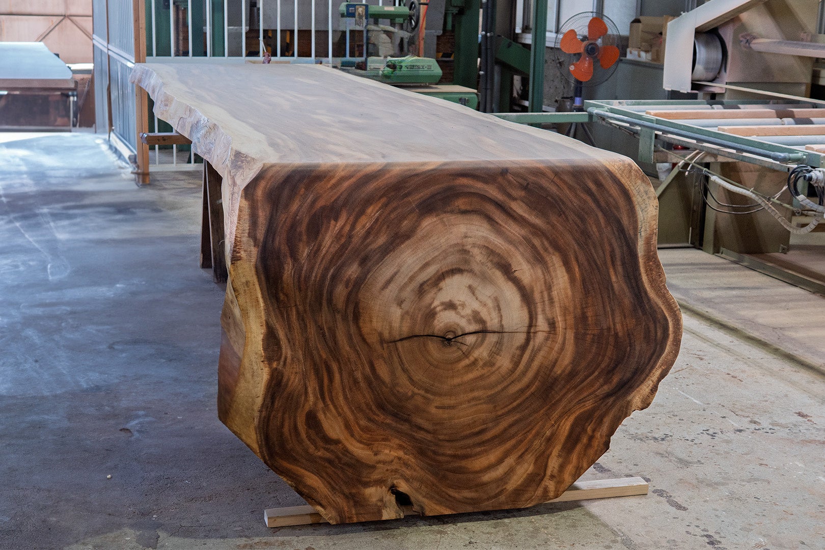 丸太そのものの形や木目、節、年輪といった自然が刻んだ個性を尊重しながらも、建築空間に溶け込み、日常的に使える機能性を兼ね備えた「究極の一点物」。空間に置かれた瞬間から主役となり、訪れる人に強烈な印象を残す存在感を放つ。岡崎製材が掲げるブランドコンセプト「NATURE DESIGN」を体現する象徴的なプロダクトであり、自然美と機能性を高度に融合させた結晶といえる。
