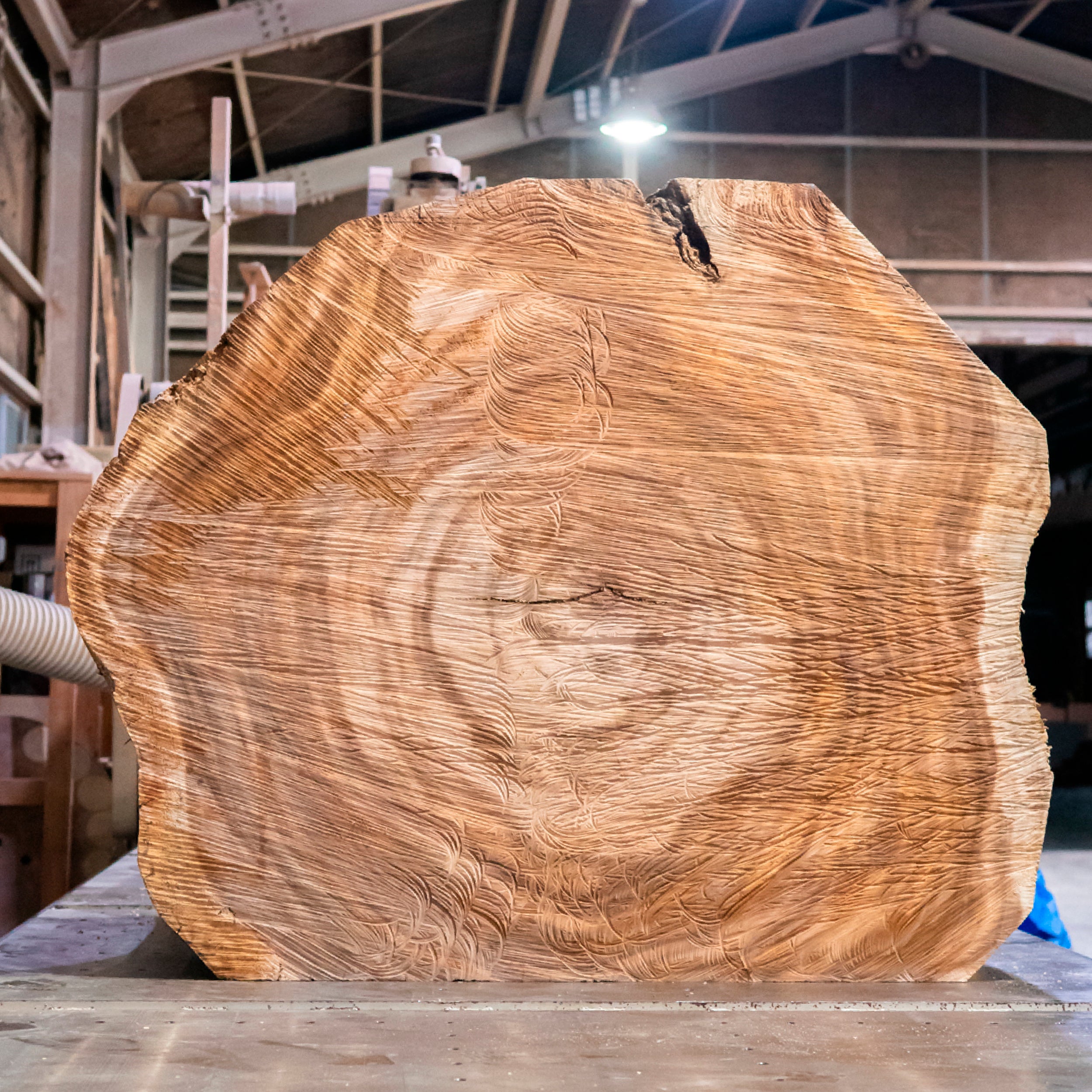 LOG-flowは 「丸太(log)」+「流れる(flow)」の意味。流れるような形状と木目のうねりや歪みの組み合わせが、空間の中で圧倒的な存在感を放つ。