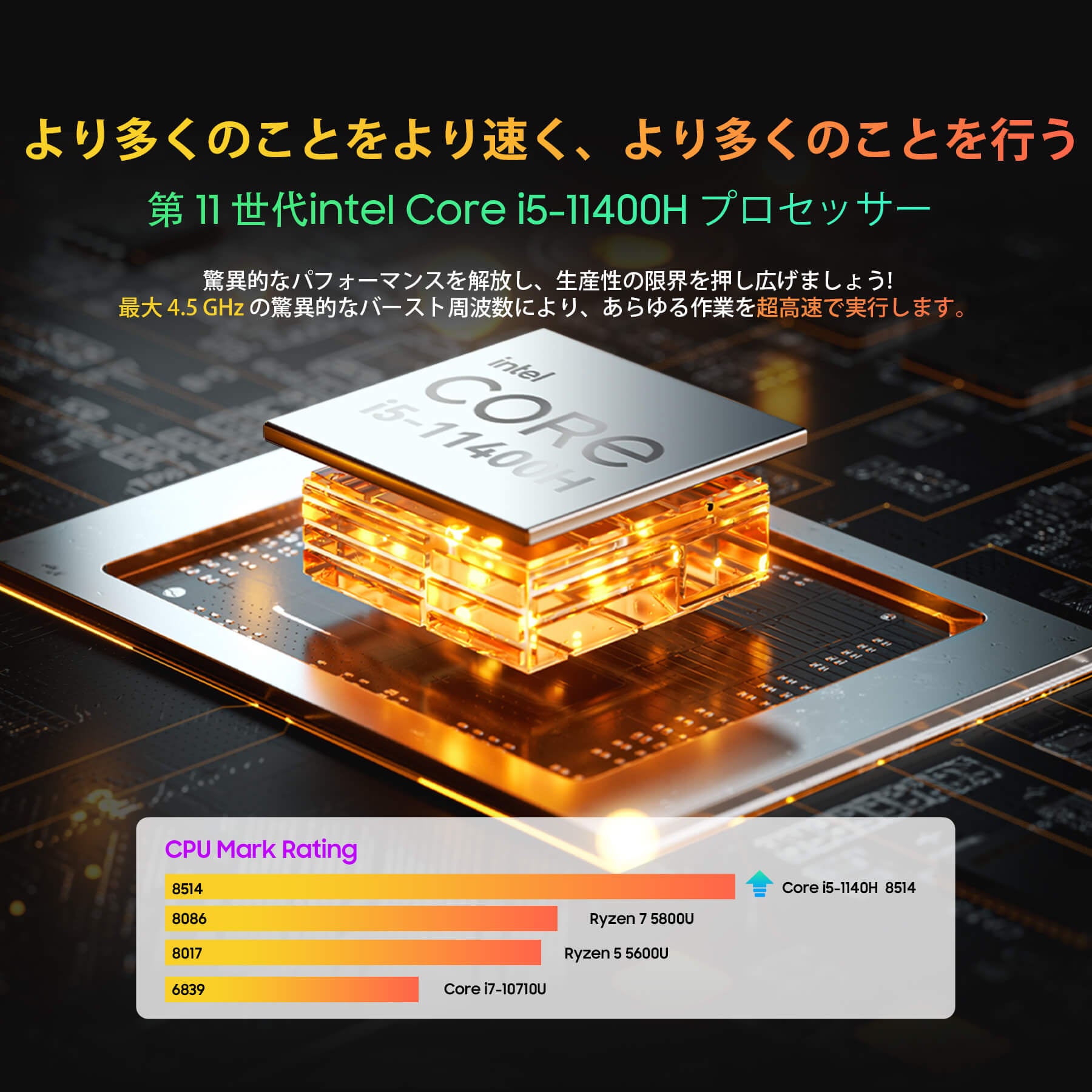 CPUにはIntel Core i5-11400Hを採用。RAMを16GB搭載するなど充実したスペック構成となっており、リモートワークやテレワーク仕事はもちろん、YouTubeやネットフリックス等のメディア視聴用途にも適しています。なお、RAMは最大128GBの拡張が可能となっています。