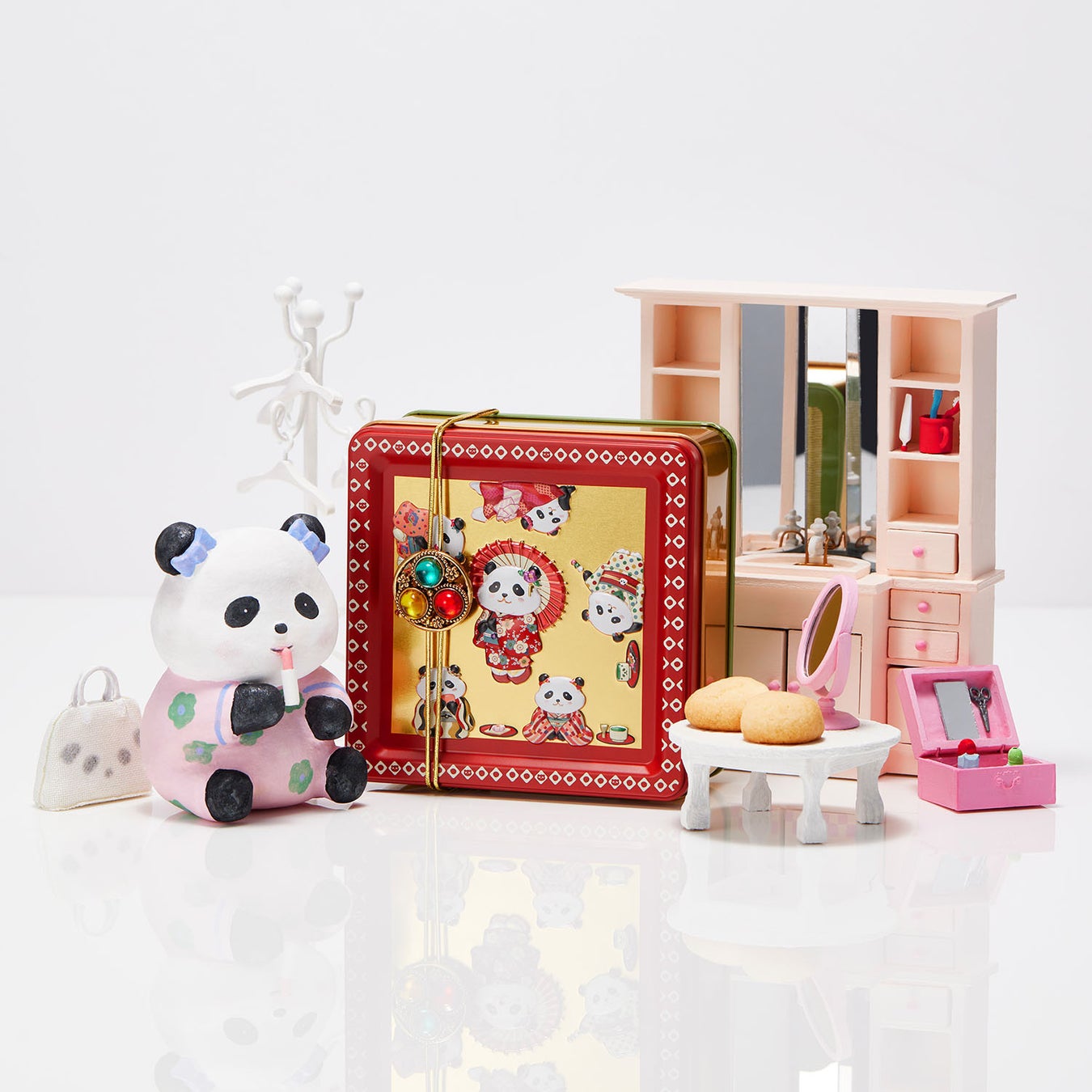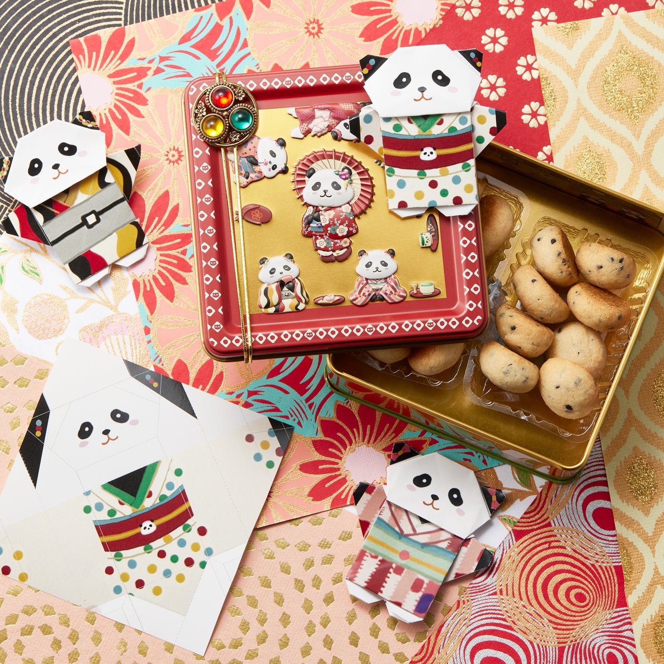 【銀座三越先行発売】缶の中までレトロ可愛いパンダが描かれた『おめかしパンダ缶』を新発売! "着物パンダ折り紙" "お風呂敷" "アヒルストラップ"付き