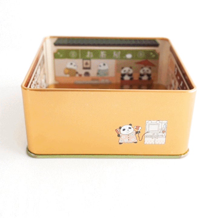 缶の蓋面にはレトロで可愛い着物を楽しむパンダ、缶の中の底面や側面にはお風呂を楽しむパンダやラーメンやお寿司、お団子を食べているパンダ、缶の底面には畳の上でくつろぐパンダが描かれています。