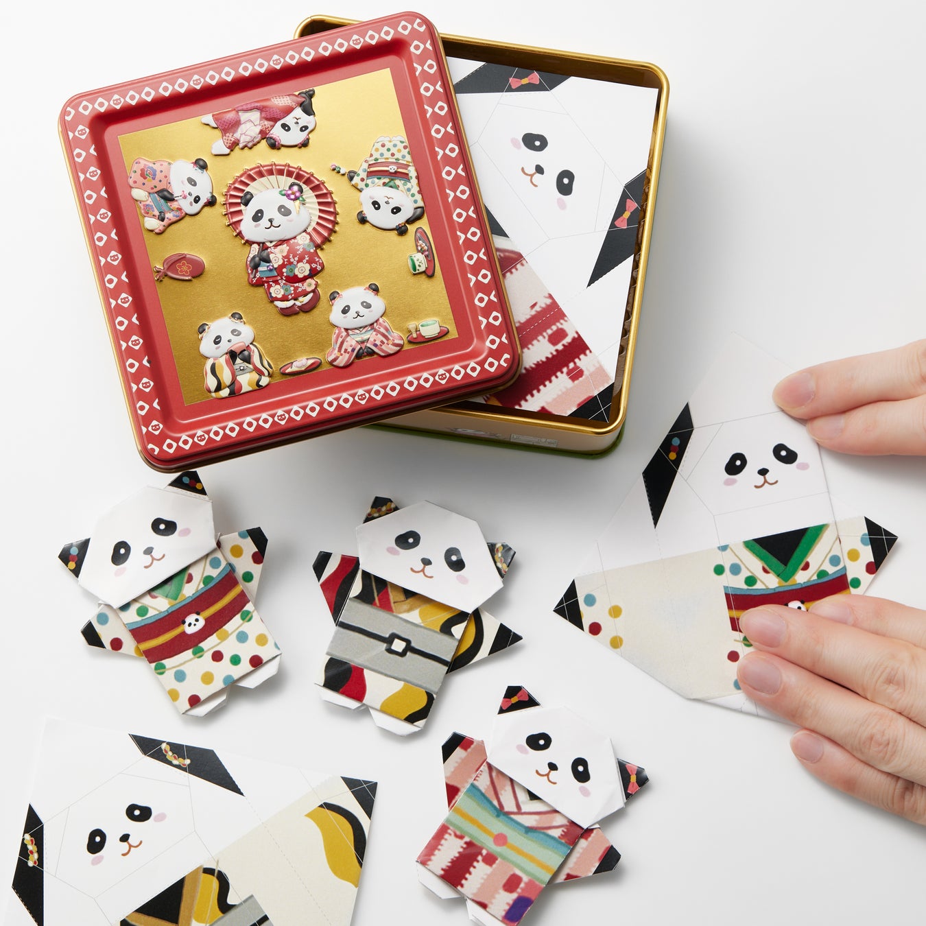 缶を開けると『着物パンダ折り紙』がもれなく一枚入っています。