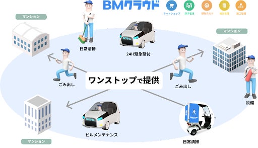 都心のマンション管理における早朝ゴミ出し対応要員不足などの社会課題を解決するとともに、WakrakのクリサポスタッフがBMクラウドを利用することにより、BMクラウドでの一元的なビルメンテナンスサービスを提供してまいります。