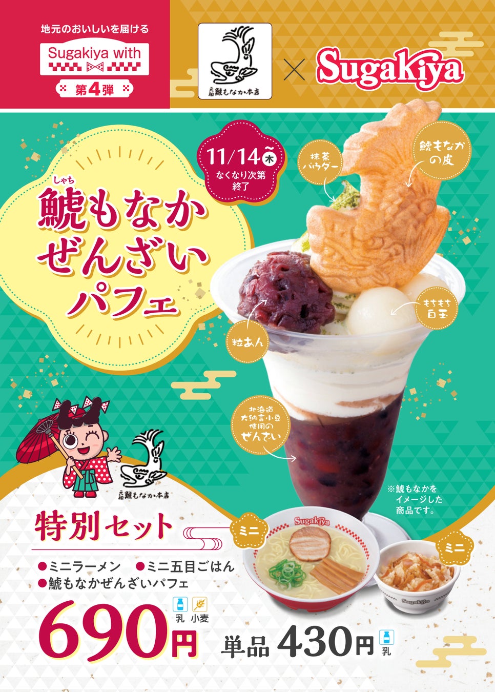 「鯱もなかぜんざいパフェ」は2024年11月14日(木)よりスガキヤ251店舗で販売いたします。