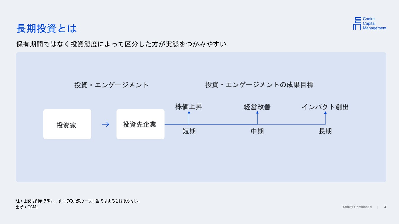 先ず『長期投資』。保有期間でなく投資態度で区分すると実態がつかみやすいと思います。株価上昇を短期、経営改善を中期、インパクト創出が長期、という事です。