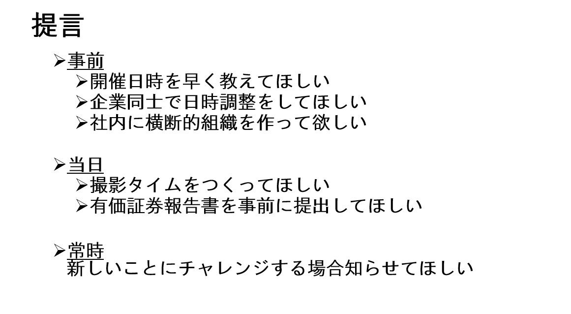 そこで、企業側に提言したい事をまとめてみました。それは、『事前』に、開催日時を早く教えて欲しい、企業同士で日時調整をして欲しい、社内で横断的組織を作って欲しい。『当日』は、撮影タイムを作って欲しい、有価証券報告書を事前に提出して欲しい。『常時』新しい事にチャレンジする場合は私たち含むステイクホルダー全体に知らせて欲しいです。意欲的な取り組みを応援し、企業の担当者にも自信をもってほしいからです」