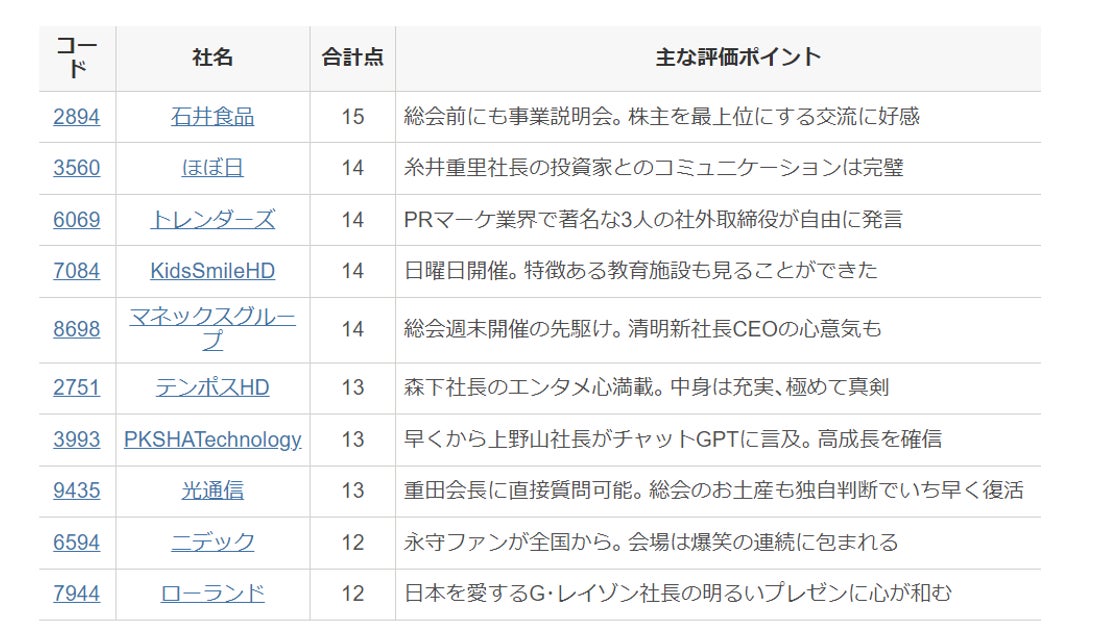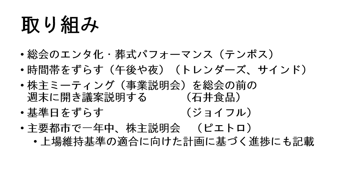 小笹:「一方で、総会中、社外取締役の話を聞きたいのに、話を一向に振ってくれず自分だけで喋る社長は、減点対象だと思います。先程、松本さんから世代交代のお話が出ましたが、最近は、従来の株式総会を変革しようと取り組んでいる企業も多く見られます。このシンポジウムの冒頭で流した動画の『テンポスホールディングス』の葬式パフォーマンスのように、総会のエンタメ化するところ。参加しやすい午後や夜に開催するといった時間帯をずらす『トレンダーズ』や『サインド』。また、『石井食品』は、総会前に事業説明会を開いて、議案説明をする丁寧な仕組みを実施しています。基準日をずらして開催する『ジョイフル』や、主要都市で一年中、説明会を行なっている『ピエトロ』など、株主総会の取り組みは、企業の姿勢をはっきりと表すものといえます。