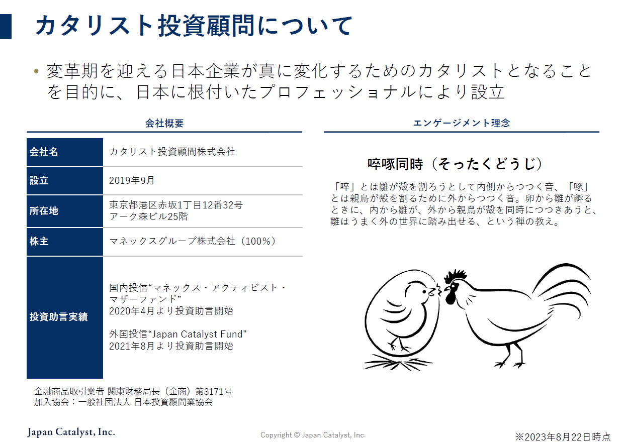『カタリスト投資顧問』は、「啐啄同時(そったくどうじ)」という禅の言葉を念頭にスタートしました。啐とは、雛が殻を割ろうとして内側から突く音。啄は、親鳥が殻を割る為に外側から突く音。この啐と啄が同時に起こると、雛鳥がふわっと外の世界へ出ていける事を表します。エンゲージメント活動が、変わろうとしている企業や担当者に、正しいやり方を教えたい。それも悠長に10年かけて行なうのではなく、短い期間で変える=利益を出して差し上げたいのです。