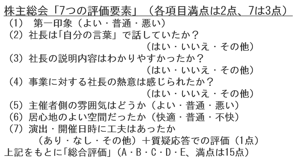 では、総会の評価は、どこにポイントを当てて見たらいいのでしょうか?7つの評価要素をここでスコアリングしました。①第一印象は? ②社長は、自分の言葉で話していたか? ③社長の説明内容は、分かりやすかったか? ④事業に対する社長の熱意は感じられたか? ⑤主催者側の雰囲気はどうか? ⑥居心地のいい空間だったか? ⑦演出・開催日時に工夫はあったか? これら各項目の満点を2〜3点と加算し、15点満点として点数評価したAランクの会社がこちら(下記の表)です。