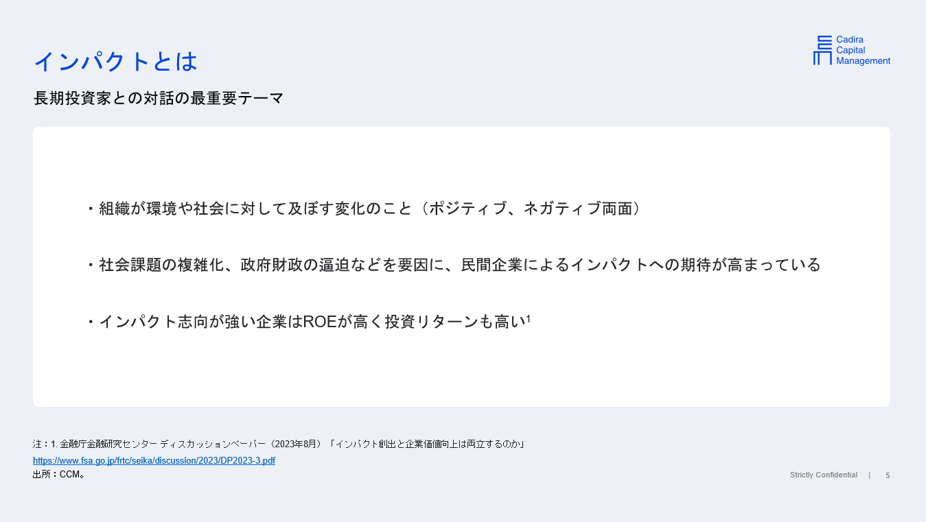 本日は、『長期投資』『インパクト志向の対話』『長期投資家視点での株主総会のポイント』の3つのポイントに絞ってお話させていただきます。