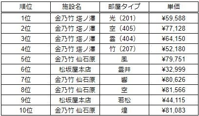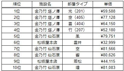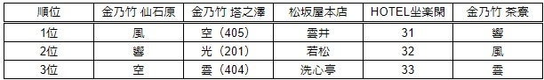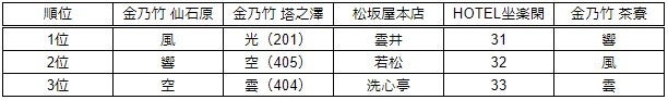 年間ランキングの1位は金乃竹 塔之澤 光タイプの部屋(201)となり、上位4位までを金乃竹 塔ノ澤が占める結果となりました。金乃竹 塔ノ澤は、敷地面積約20,000坪という広大な自然を背景として、塔ノ澤の自然に溶け込む為のこだわりの空間が大人だけの解放区として20代~40代のカップル・夫婦を中心に支持を得ております。1位「光」の部屋タイプは、木の香りにも癒される青森ヒバの浴槽の露天風呂を採用しており、テラスには温泉リゾートを愉しむ「姫(HIME)ベット」があり人気です。2位の「空」と3位の「雲」はクラブフロアで、お部屋でのチェックイン、ミニバーが無料、チェックアウト時間の延長などの特典が人気の理由です。