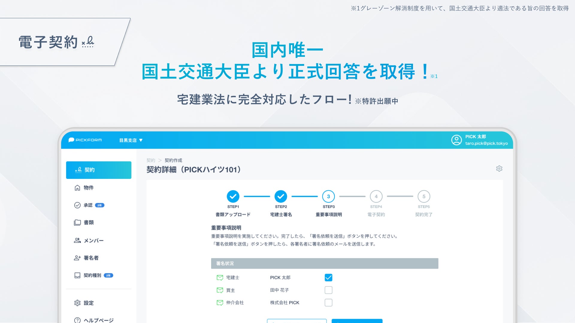 「PICKFORM 電子契約」では国内で唯一国土交通大臣より正式回答をもらい、新しい法律に対しても安心して”適法に”利用いただけるサービスとして、導入企業が増えております。