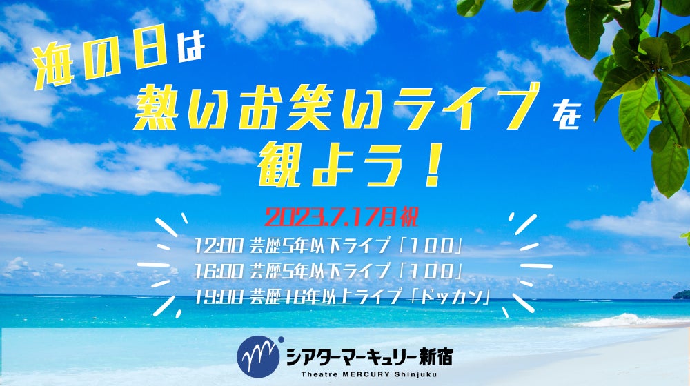 シアターマーキュリー新宿では、海の日である2023年7月17日(月祝)にお笑いライブである『芸歴5年以下ライブ「100」』を2公演、『芸歴16年以上ライブ「ドッカン」』を1公演の計3公演開催いたします。