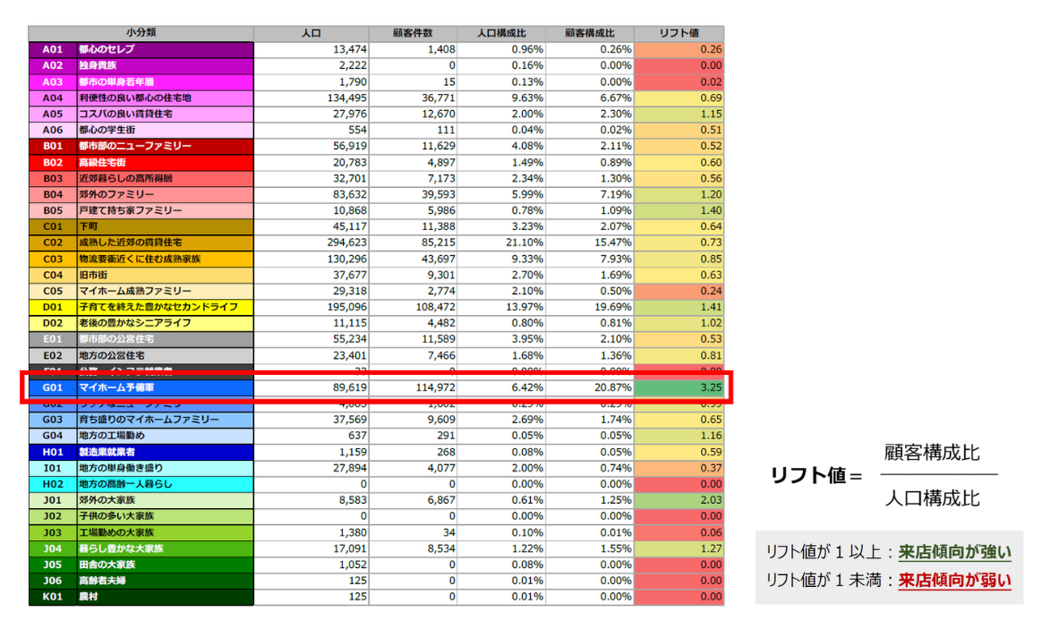 自社顧客の住所データと「c-japan🄬」をGIS(地図情報システム)上で重ね合わせ、各セグメントのリフト値(顧客構成比/人口構成比)を算出。リフト値が高く出たセグメントを来店傾向が強い層とみなし、優良顧客のペルソナを把握した例となります。
