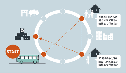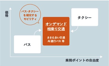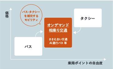 本実証事業は、青森県つがる市 下牛潟~派立、前村地区において、地域のタクシー会社3社と連携(※1)し、既存のバス路線等を活用し、利用者の要求(デマンド)に対応して運行する新たな交通サービスの構築を目的としています。路線バスとタクシーの間に位置する新たな交通手段として、バス路線が少ないエリアで運行します。