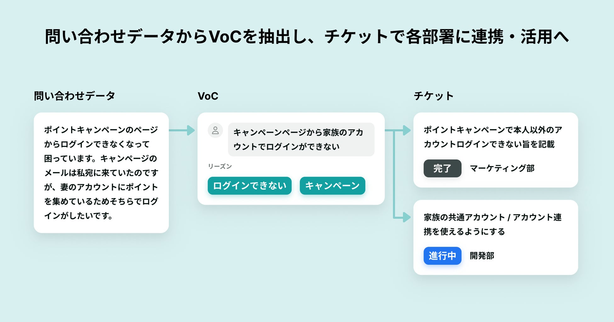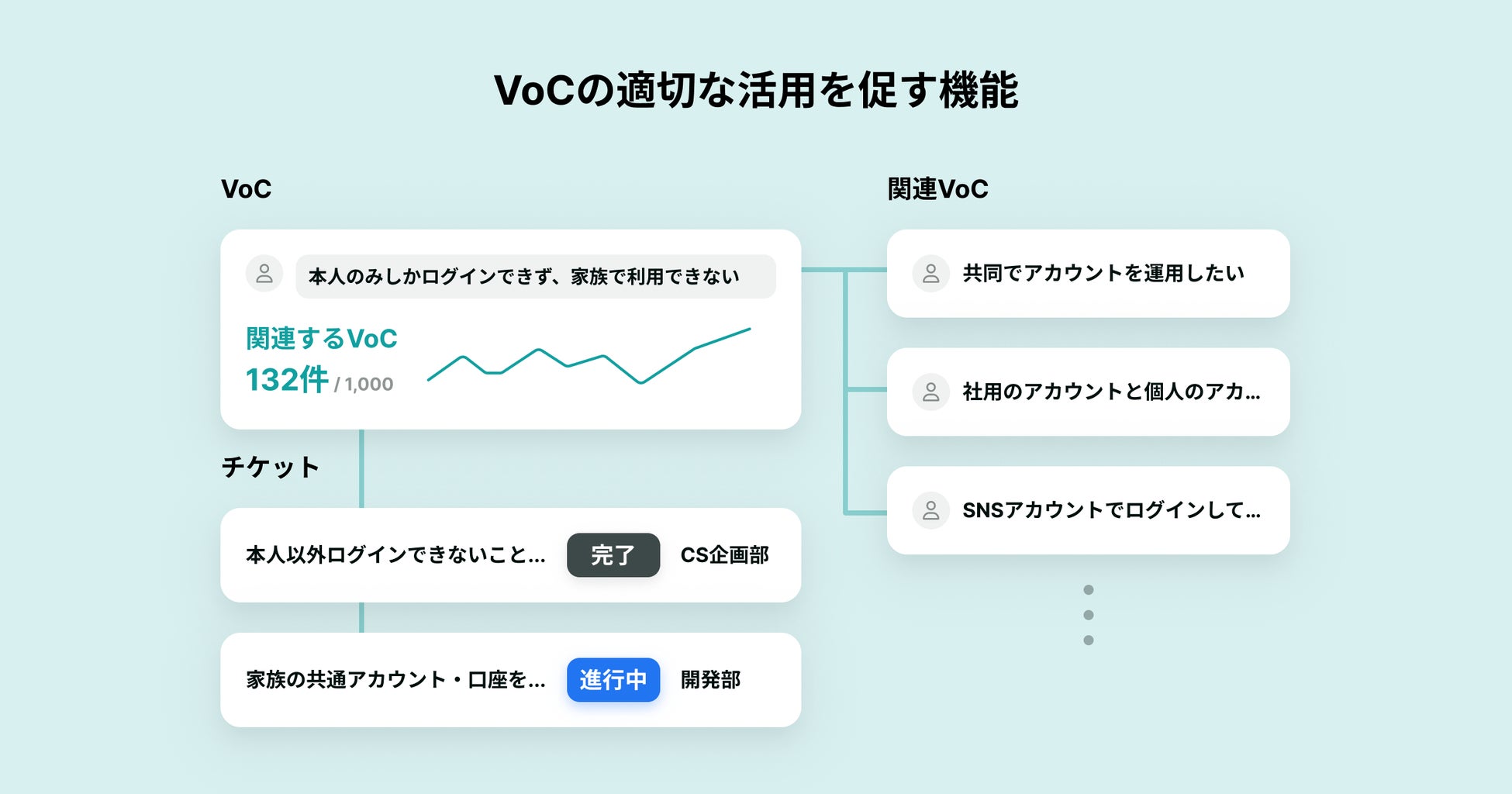 個々のVoCの羅列だけでは導き出せない課題の重要度を、類似の声を自動集計し定量で可視化する「関連VoC機能」や、適切なアクセス権限やタスクごとのアサインやステータスを一元管理ができる「チケット機能」など、CS部門だけではなく全社で活用できる様々な機能を実装しています。