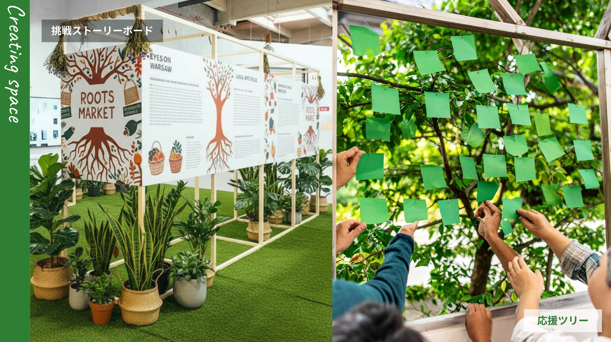 本マルシェの最大の特徴は、挑戦者の想いに触れ、来場者が応援の気持ちで購入できるよう設計されている点です。まず、出店者は事前ワークショップを通じて自分の「挑戦ストーリー」を言語化し、当日はそれを可視化した「挑戦ストーリーボード」を掲示します。来場者はストーリーを読みながら出店者の背景に触れ、自然と応援の気持ちが生まれる仕掛けです。さらに、共感した想いを“葉”として貼り付ける「応援ツリー」を会場内に設置し、応援の可視化と参加者同士の一体感が育まれるよう工夫しています。