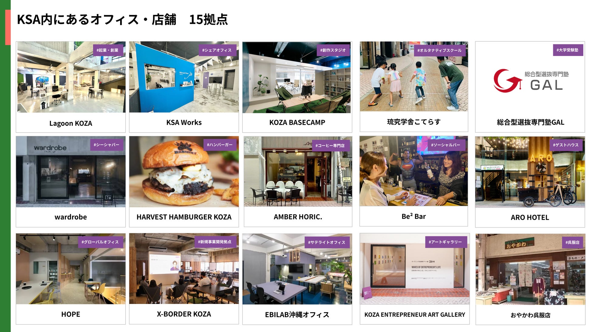 KSAは、「挑戦の循環をつくり、新しい産業と文化を生み出す」をミッションとして、コザの街を舞台に、シェアオフィスの開設や県外オフィスの誘致、コーヒーショップやオルタナティブスクールの開業支援など、コザに根差した活動を続けてきました。