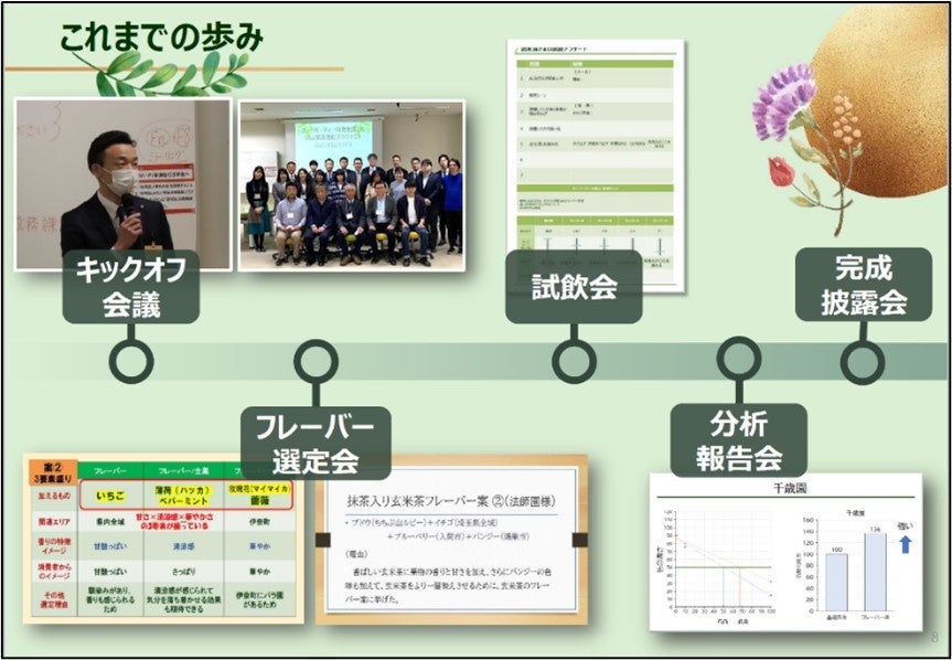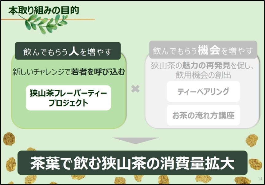 狭山茶フレーバーティーの展開を通じ、狭山茶を飲むことの間口を広げるとともに、狭山茶の素晴らしさを広く知らしめることにより、更なる認知度向上や消費拡大等、狭山茶産業の活性化に寄与してまいります。また、嗅覚センサーの活用や香り成分の数値化を行い、サービス開発への検証を行います。
