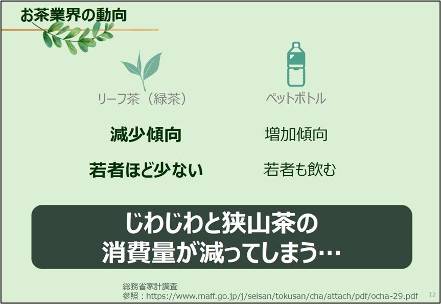入間市、日本薬科大学およびNTT東日本は、近年のリーフ茶の消費量減少に対し、リーフ茶を飲むことの間口を広げるための新たなチャレンジとして、「料理のおとも」に留まらず食間に主役として飲むことのできるフレーバーティーの製作を推進し、狭山茶活性化に取り組んでまいりました。