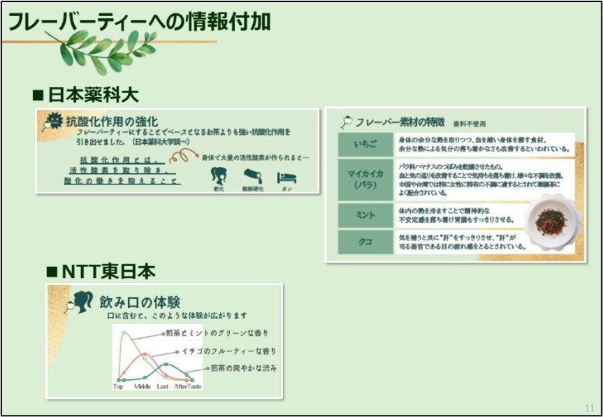 完成した狭山茶フレーバーティーについて、日本薬科大学およびNTT東日本の分析を通じ抗酸化作用の強さや飲み口のイメージを明らかにしました。