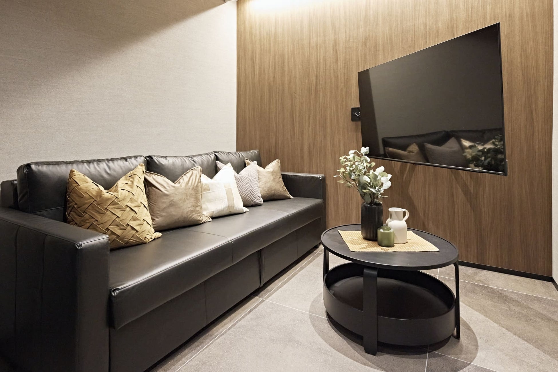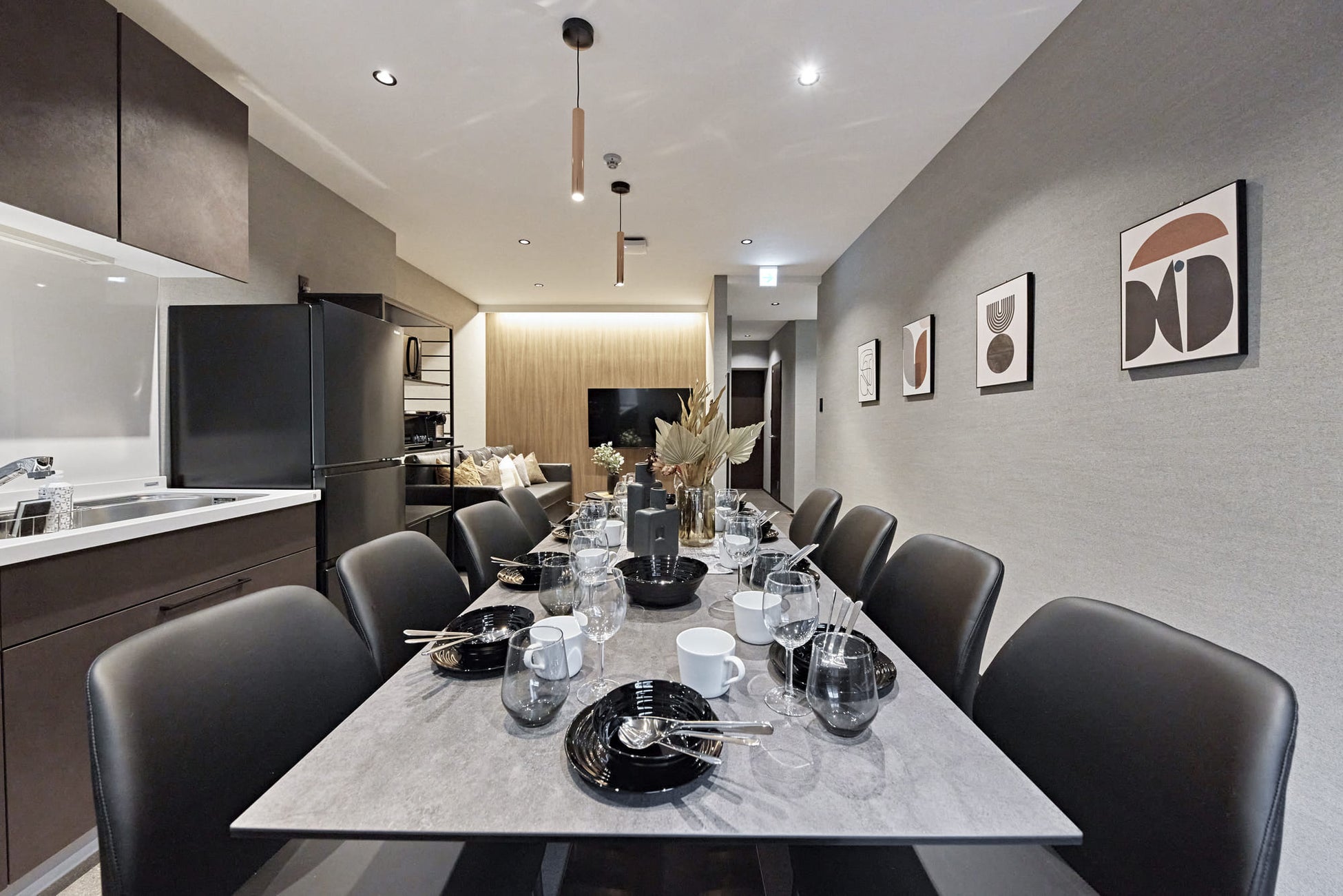 2階エントランスを入ると、まるで高級ホテルのような落ち着いた雰囲気のある空間がゲストをお出迎え。大勢が集うことができるリビングダイニングは、大きなキッチンが併設されており調理機器やキッチン家電、食器類を豊富に取り揃えています。