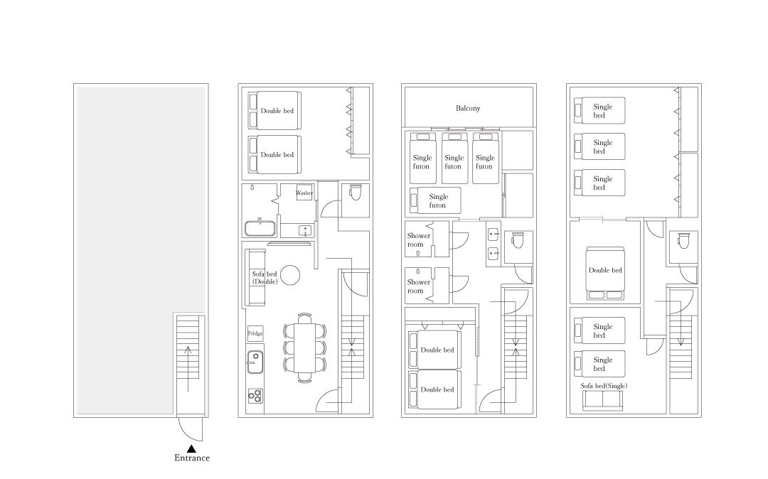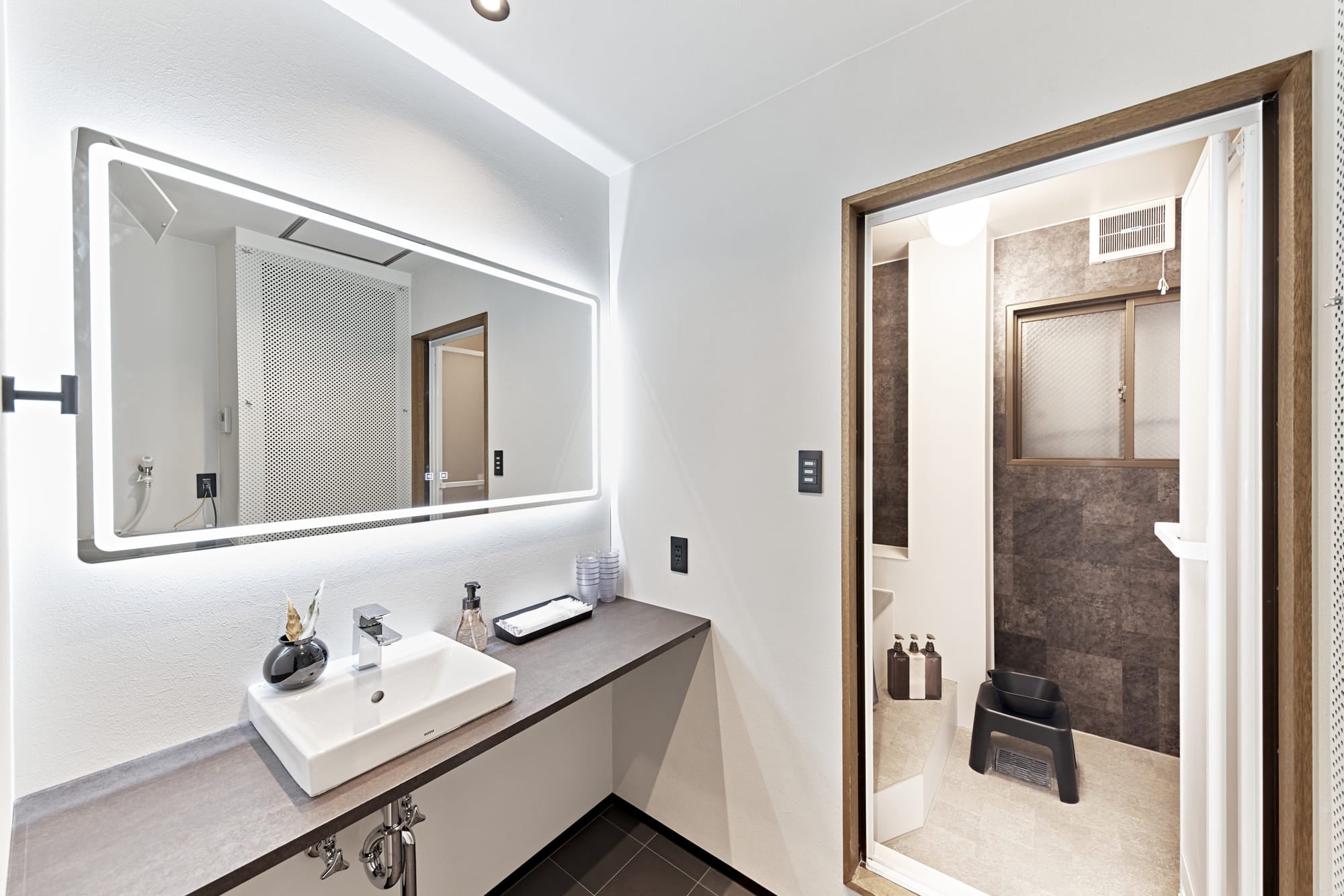2階から4階が宿泊エリアとなっており、各フロア異なるテイストのインテリアを採用し、和と洋の両方を楽しめる空間となっています。浴槽付きバスルームやシャワールームなど水回り設備が充実しているので大人数の宿泊でも快適に過ごすことができます。