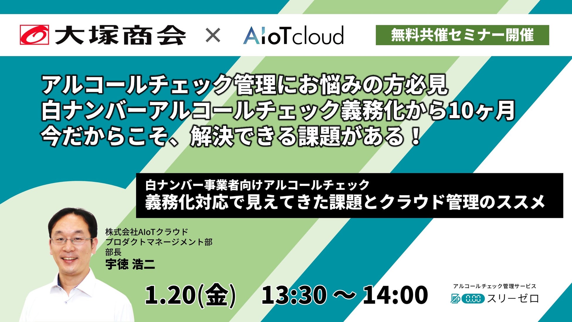 アルコールチェック管理サービス『スリーゼロ』(https://alc.aiotcloud.co.jp/ )を提供する株式会社AIoTクラウド(本社:東京都江東区、代表取締役社長:石黒 豊、以下:AIoTクラウド)は、株式会社大塚商会(本社:東京都千代田区、代表:代表取締役社長 大塚 裕司、以下:大塚商会)とともに、改正道路交通法施行規則への対応にお困りの安全運転管理者・総務担当者を対象にした『白ナンバー事業者アルコールチェック義務化対応で見えてきた課題とクラウド管理のススメ』を2023年1月20日(金)13:30からオンラインにて開催いたします。