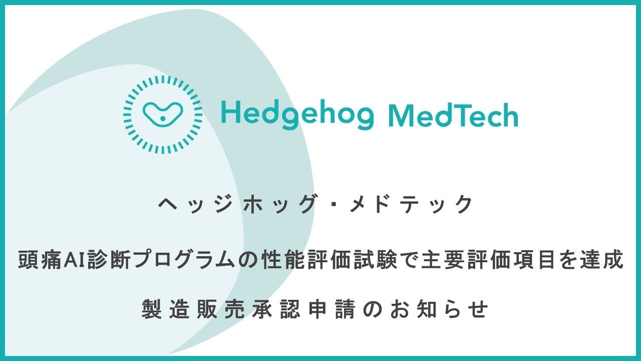 株式会社ヘッジホッグ・メドテック(本社:東京都文京区、代表取締役CEO 川田裕美、以下ヘッジホッグ・メドテック)は、頭痛AI診断プログラムの性能評価試験で主要評価項目を達成したことを踏まえ、2026年1月28日に製造販売承認申請を行いました。現在国内において薬事承認や保険適用を受けた「頭痛診断用プログラム」はなく、製造販売承認申請も日本初*となります。
