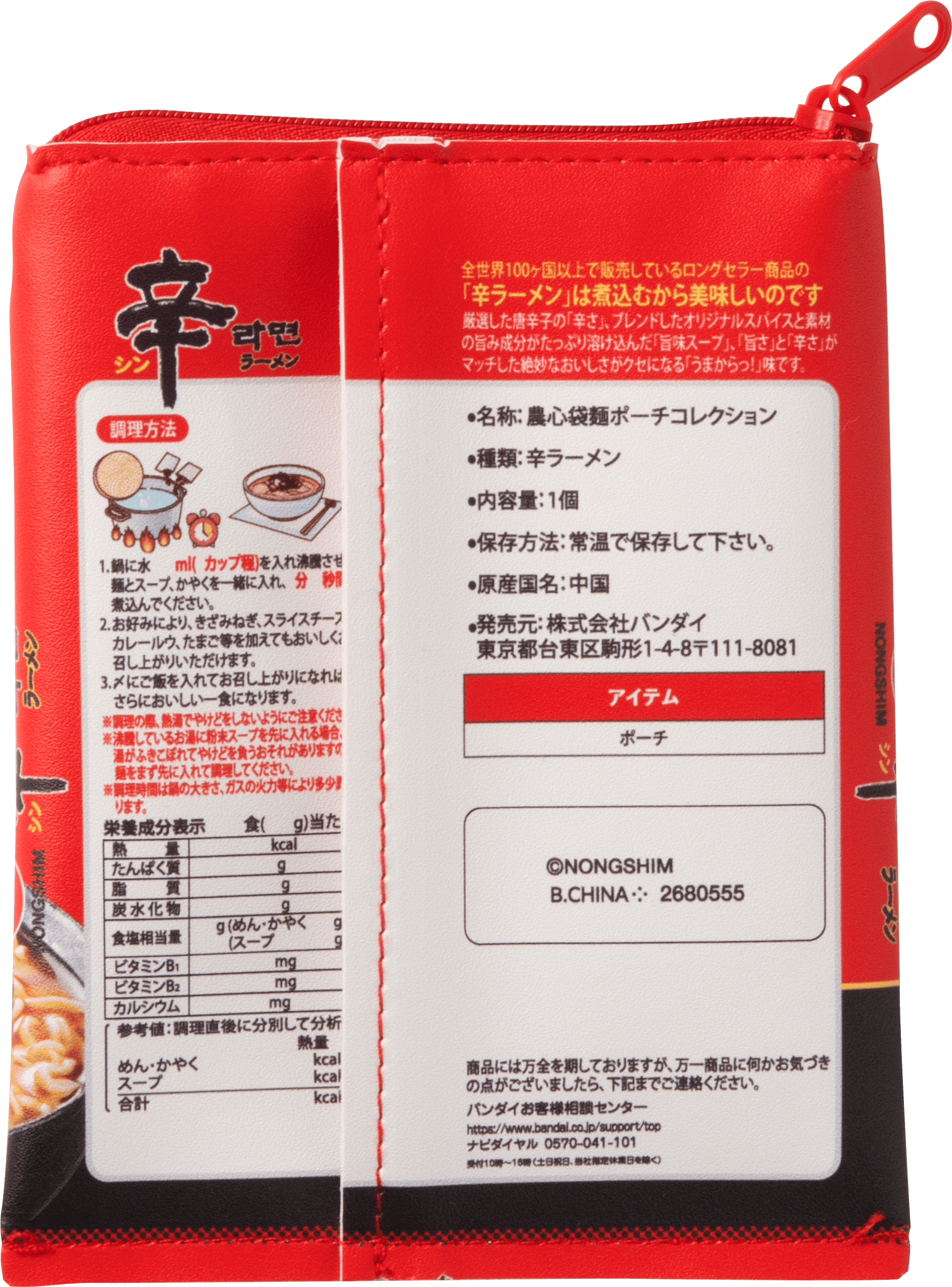 このたび発売する待望の第二弾『農心 袋麺ポーチコレクション』は、当社の人気袋麺7種がポーチになって登場。約150mmのビッグサイズで裏面の形状やデザインも再現されており、女性にとってはリップ用品や櫛等の小物を持ち運ぶのに便利で、実用性も高いアイテムです。