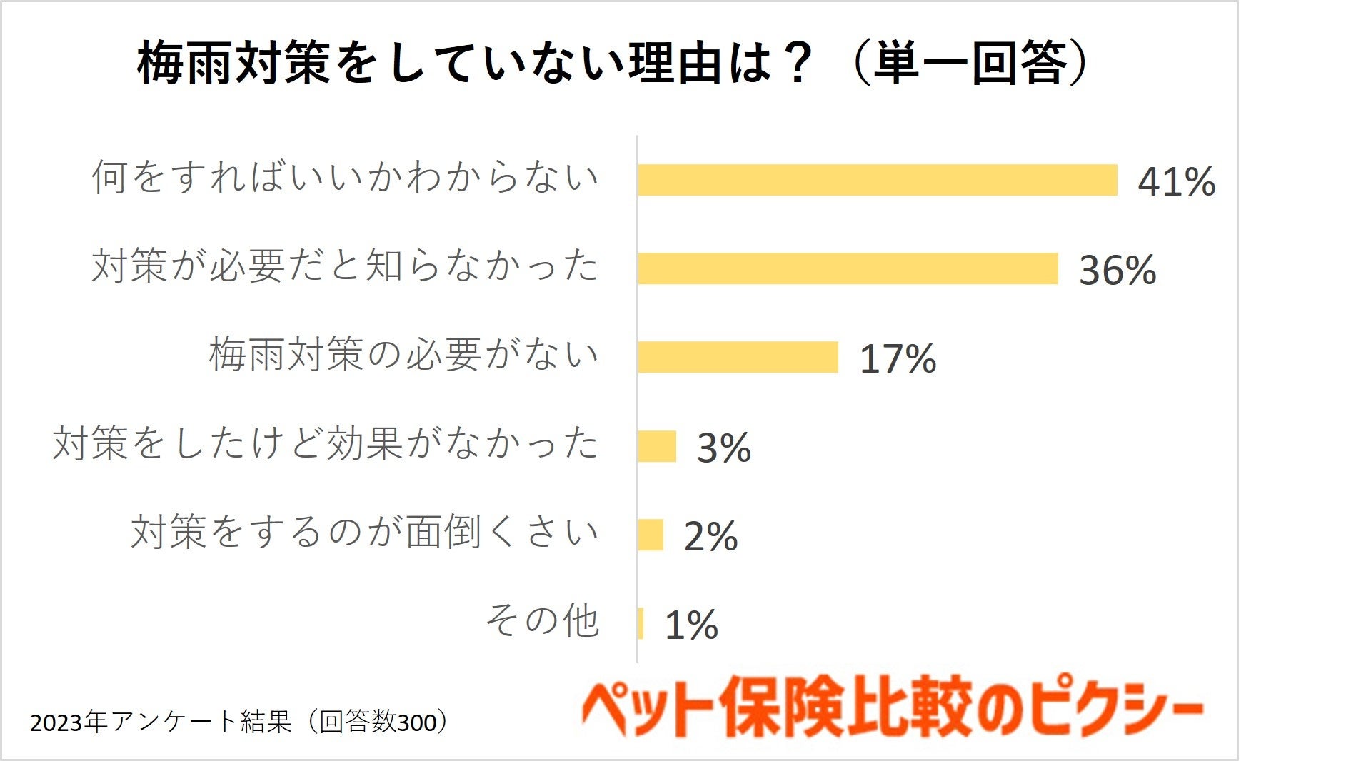 最初の質問で「梅雨対策をしていない」と答えた人に、梅雨対策をしない理由を聞いたところ、1位は「何をすればいいかわからない(41%)」という理由でした。さらに「梅雨対策が必要だと知らなかった(36%)」という理由が2位につづきます。