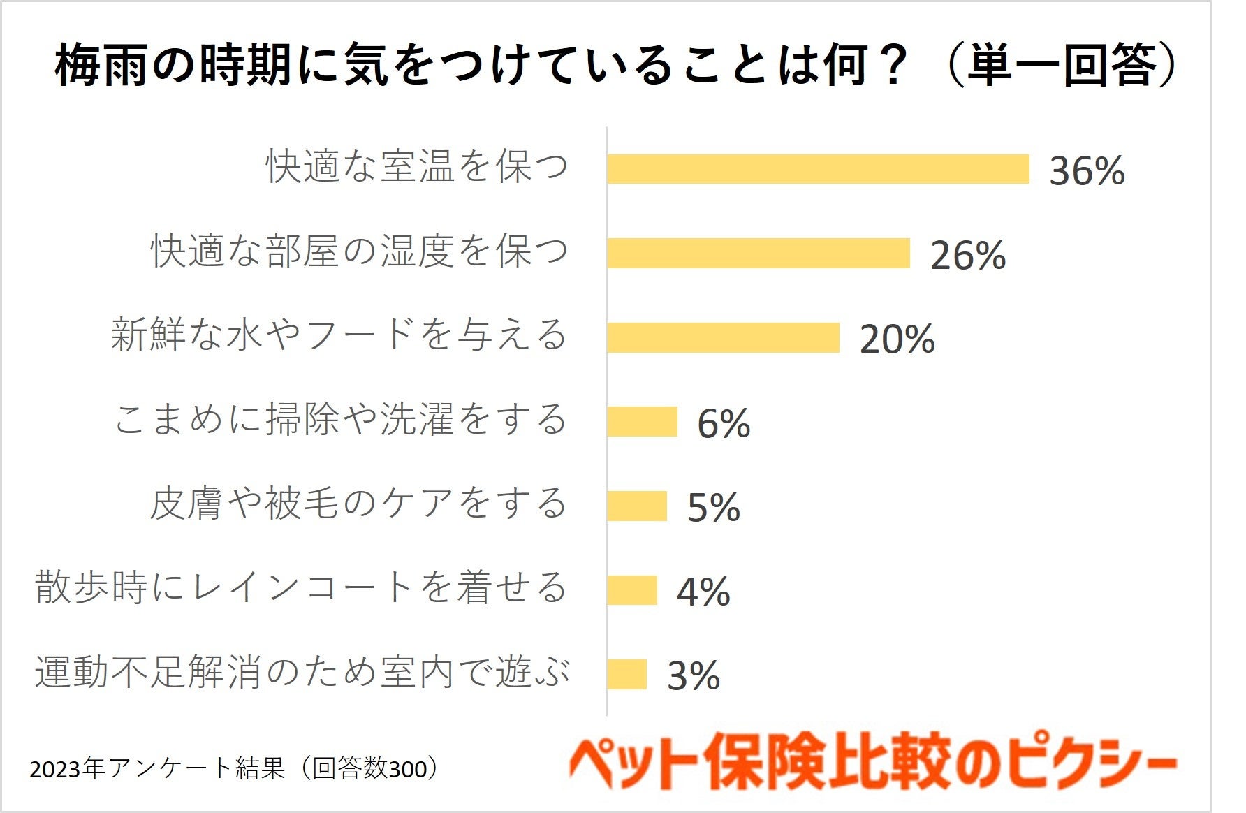 3位の「新鮮な水やフードを与える」という回答も20%と比較的多く、食中毒などを予防したい飼い主さまの意識があらわれています。一方で、梅雨の時期の運動不足や被毛ケアなどに気をつける飼い主さまは多くないようです。