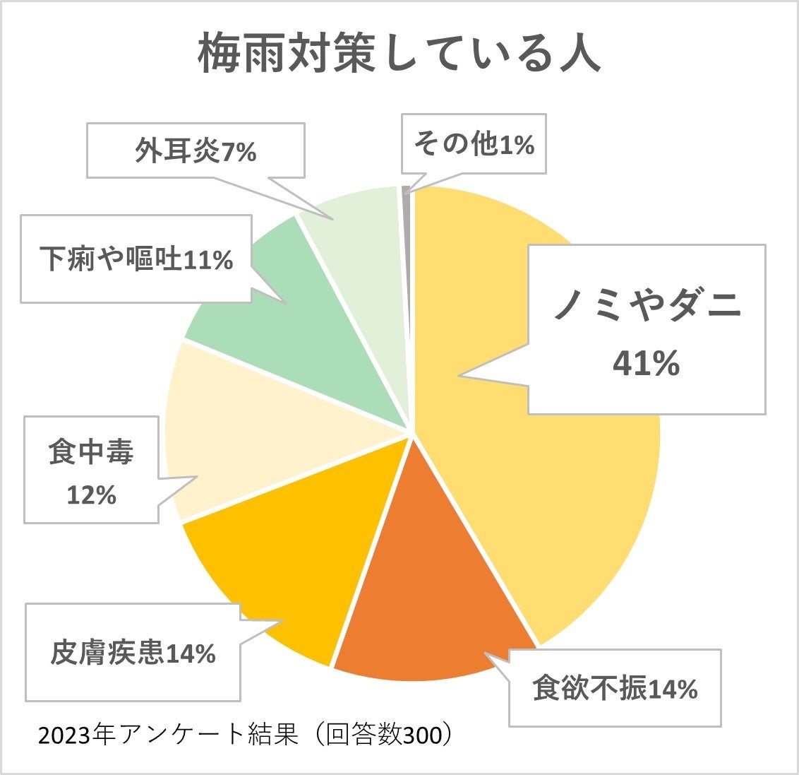 一方で、「梅雨対策をしている」と答えた人のうち「ノミやダニ」と選んだのは最多の41%で、比較的答えが集中する傾向にありました。次に多い答えは「食欲不振」と「皮膚疾患」で同率14%です。