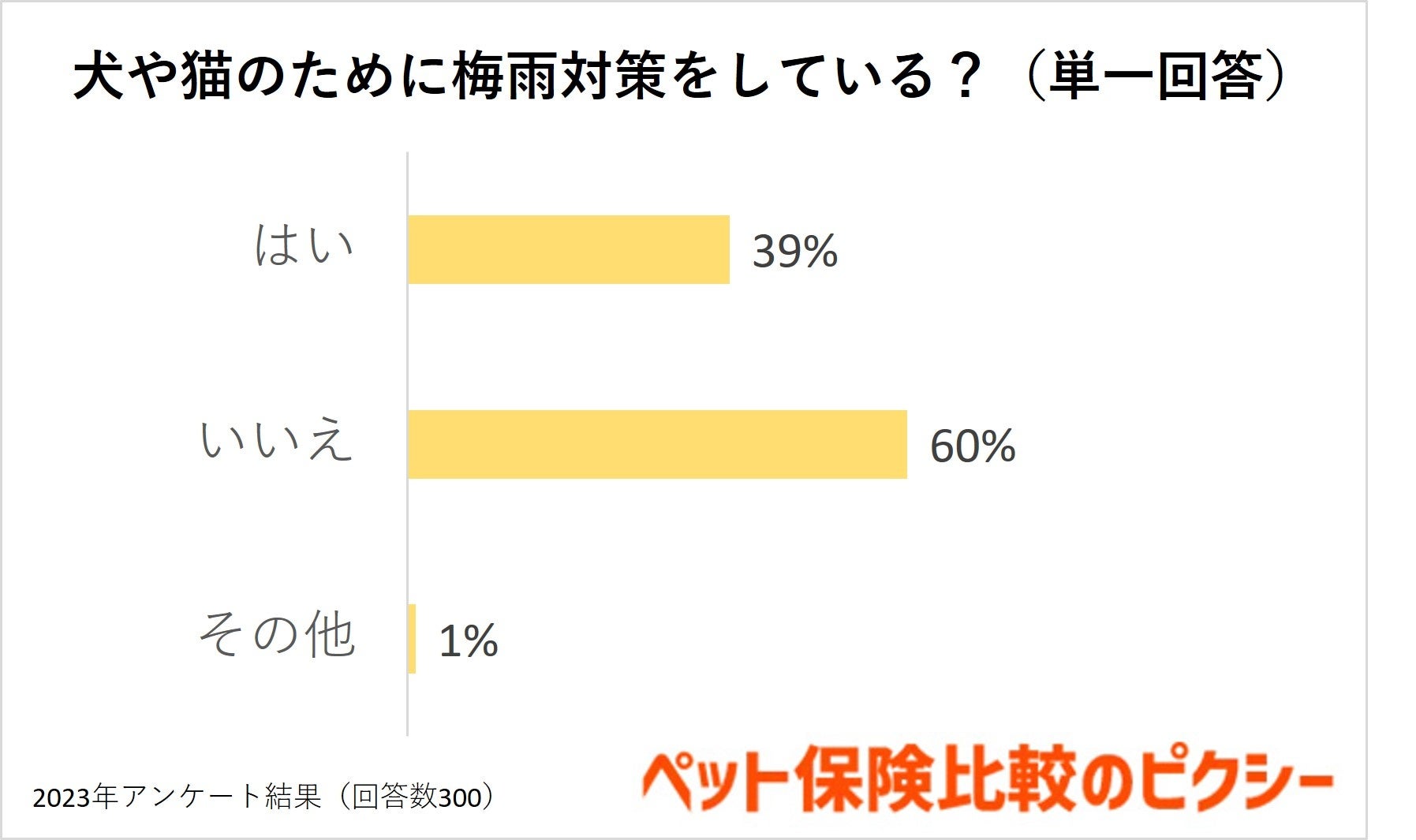 まず初めにペットのために梅雨対策をしているかどうかを質問したところ、「はい」と答えた人が39%、「いいえ」と答えた人が60%でした。梅雨対策をしていない人が、している人の数を大きく上回る結果となりました。